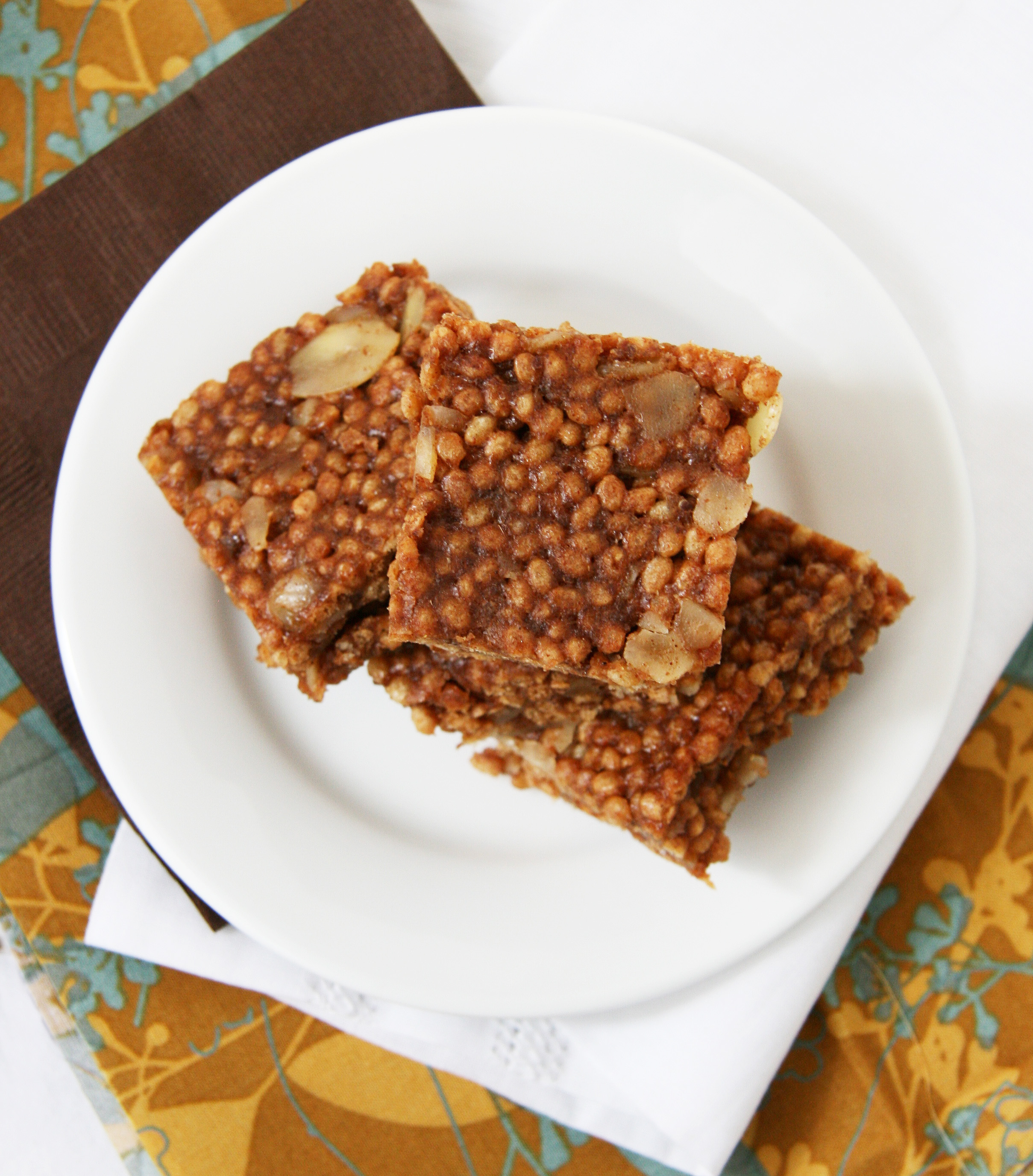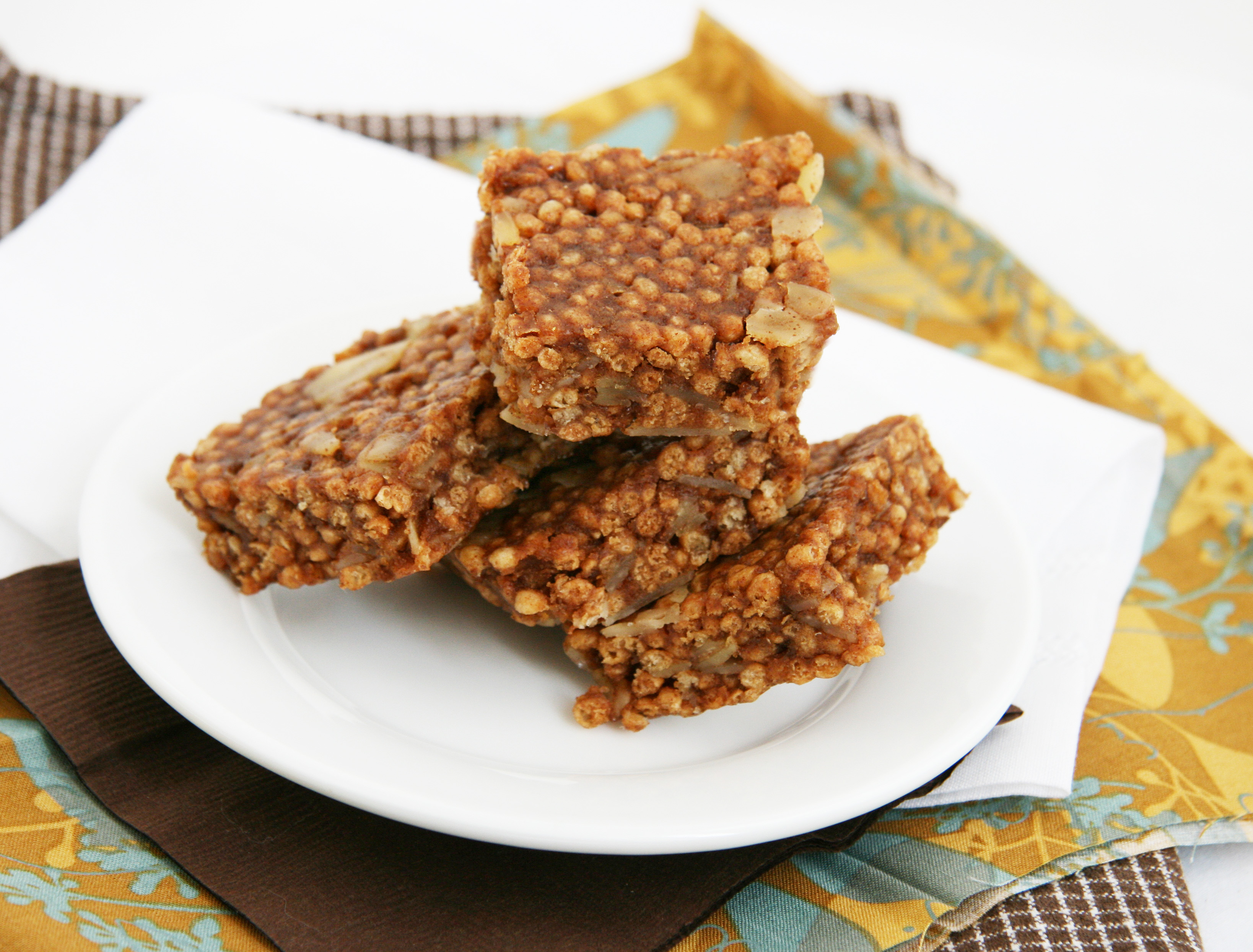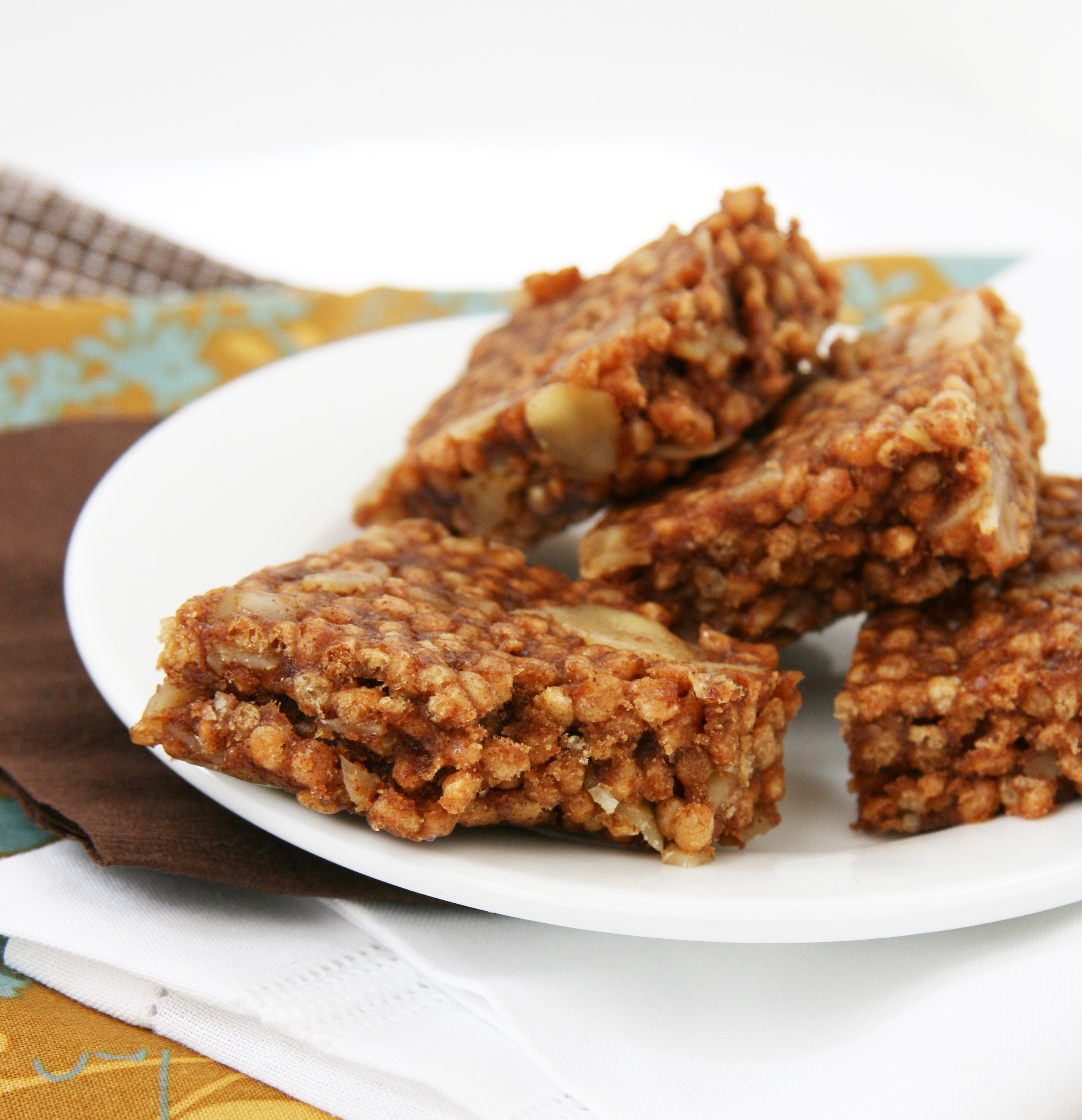 I hadn’t eaten a rice krispy treat in years and for some reason after seeing one commercial, I couldn’t get my mind off those crunchy little bars. Instead of using marshmallows, I opted for a healthier option by combing almond butter and honey as the binder and it worked nicely! I added sliced almonds for extra nuttiness along with almond extract (mmmm so good!) for the triple almond punch.