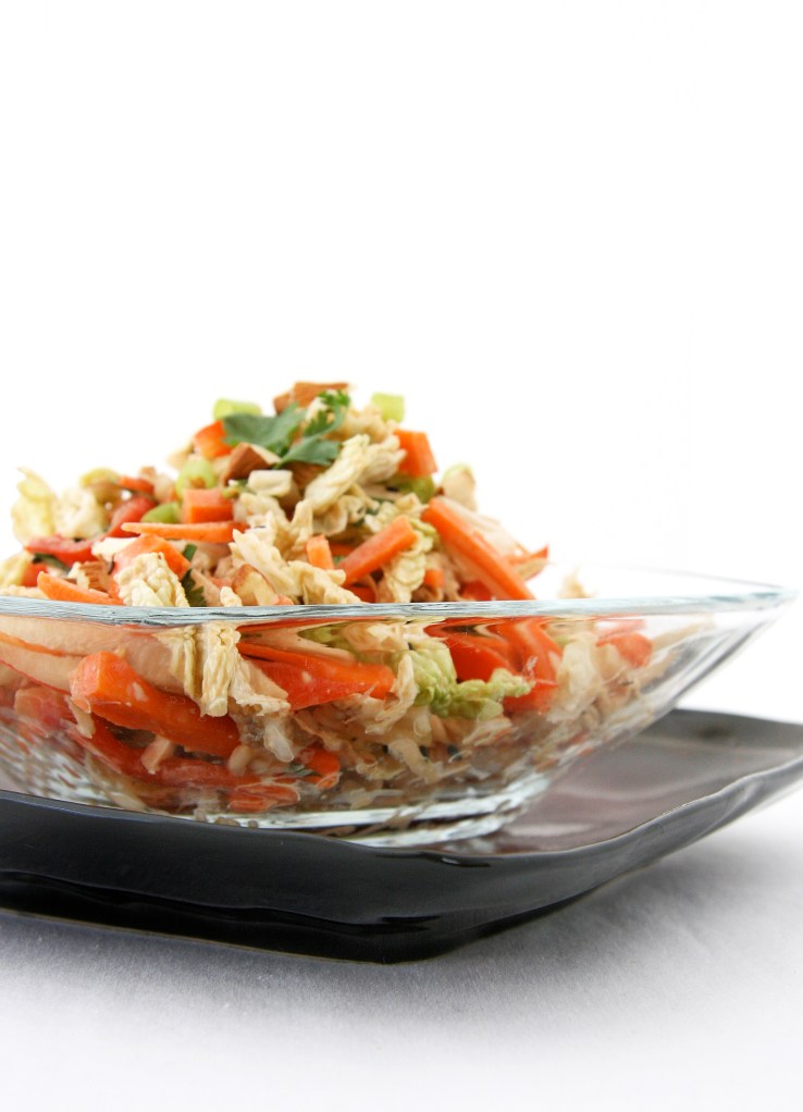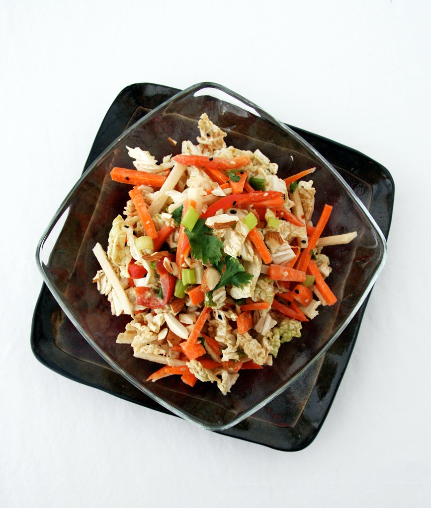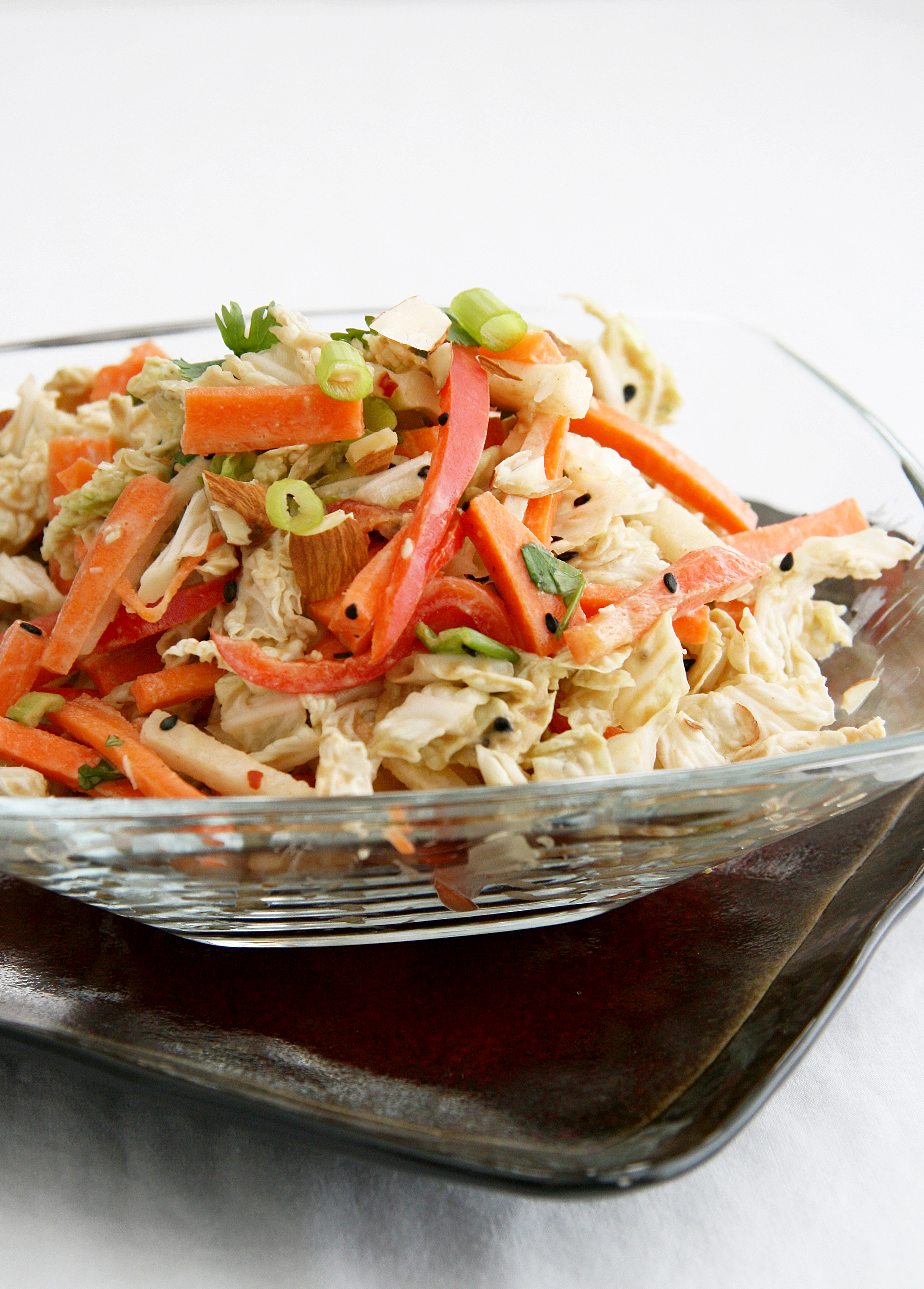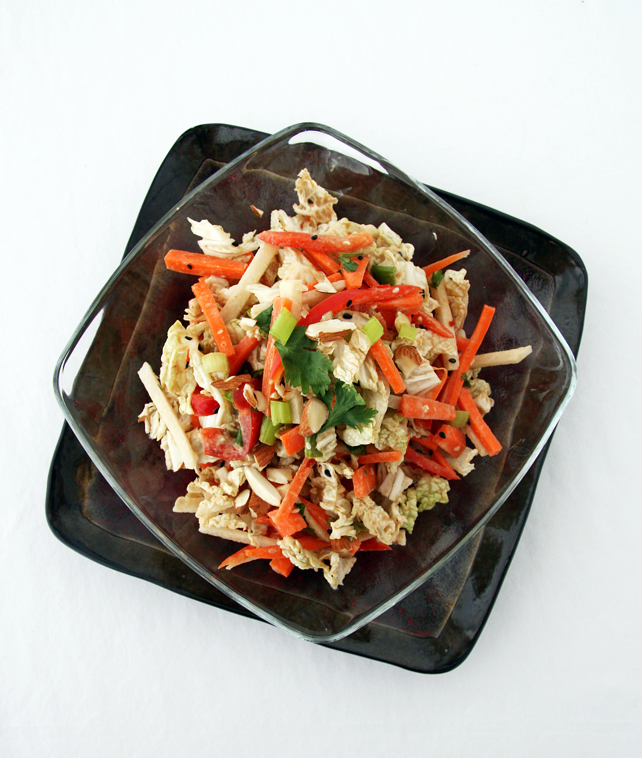 Thinly sliced Napa cabbage tossed with crunchy jicama, sweet shredded carrot and sliced red bell pepper are all lightly coated with nutty and slightly spicy peanut dressing that is satisfying and delicious. Feel free to switch up some of the ingredients to your liking – swap out or add fresh snap peas or snow peas, use chopped peanuts instead of almonds or use yellow or orange bell pepper for the red. The most time consuming part is the chopping and slicing but you could even buy the pre-shredded carrot-brocolli slaw for quick prep or use a food processor to cut down on prep time.