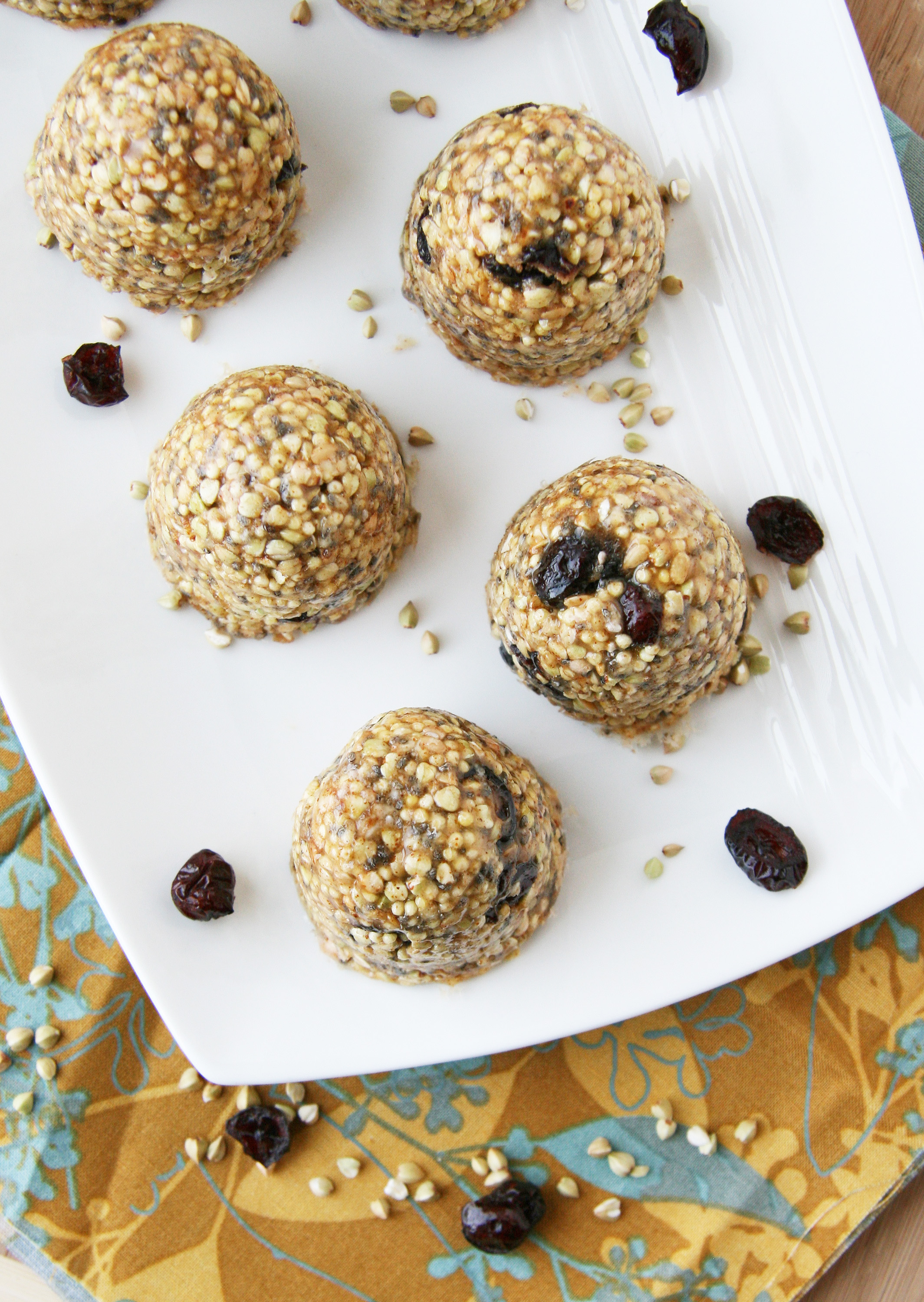 Did you ever make those bird feeders as a child with popsicle sticks, peanut butter and bird seeds? The look of these remind me of those homemade bird feeders BUT they are really yummy and made for human consumption. Crunchy yet chewy and full of protein and flavor, these bites are no-bake, nut-free, quick and filling. They are adaptable too; add your favorite dried fruit, spices, seed/nut butter and make it your own. I will be making these again asap with different mix-ins.