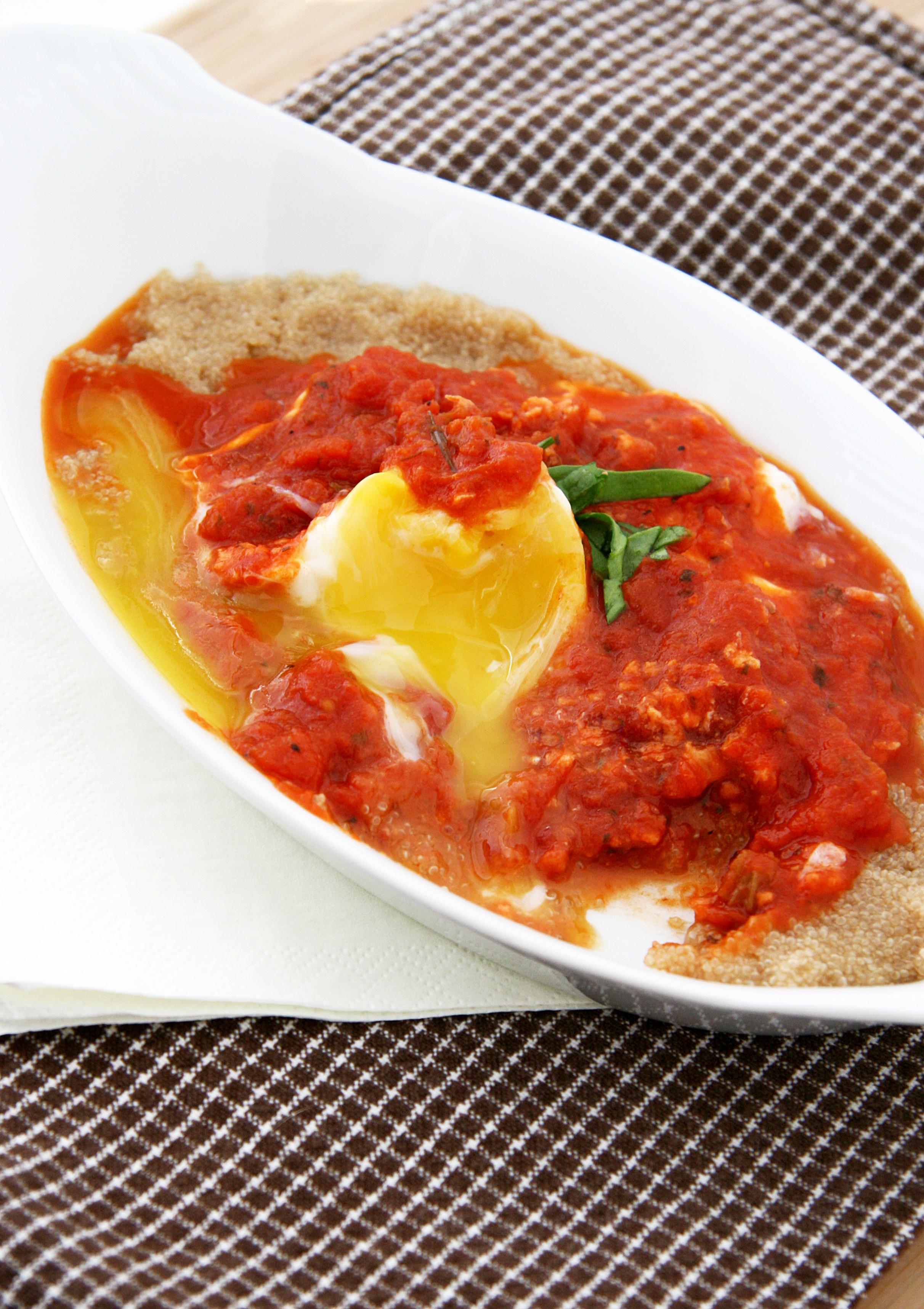 2. When amaranth grits only have 5 minutes left to cook, heat 2 cups of tomato sauce over low-medium heat in a small saucepan until it simmers. Carefully crack eggs one at a time and gently slide into the simmering tomato sauce, cover and let cook for 4-5 minutes or until eggs white are white and cooked through and the middle is still runny.