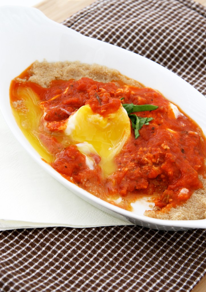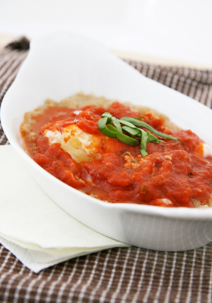 Easy Tomato Sauce Poached Eggs over Cheesy Amaranth Grits