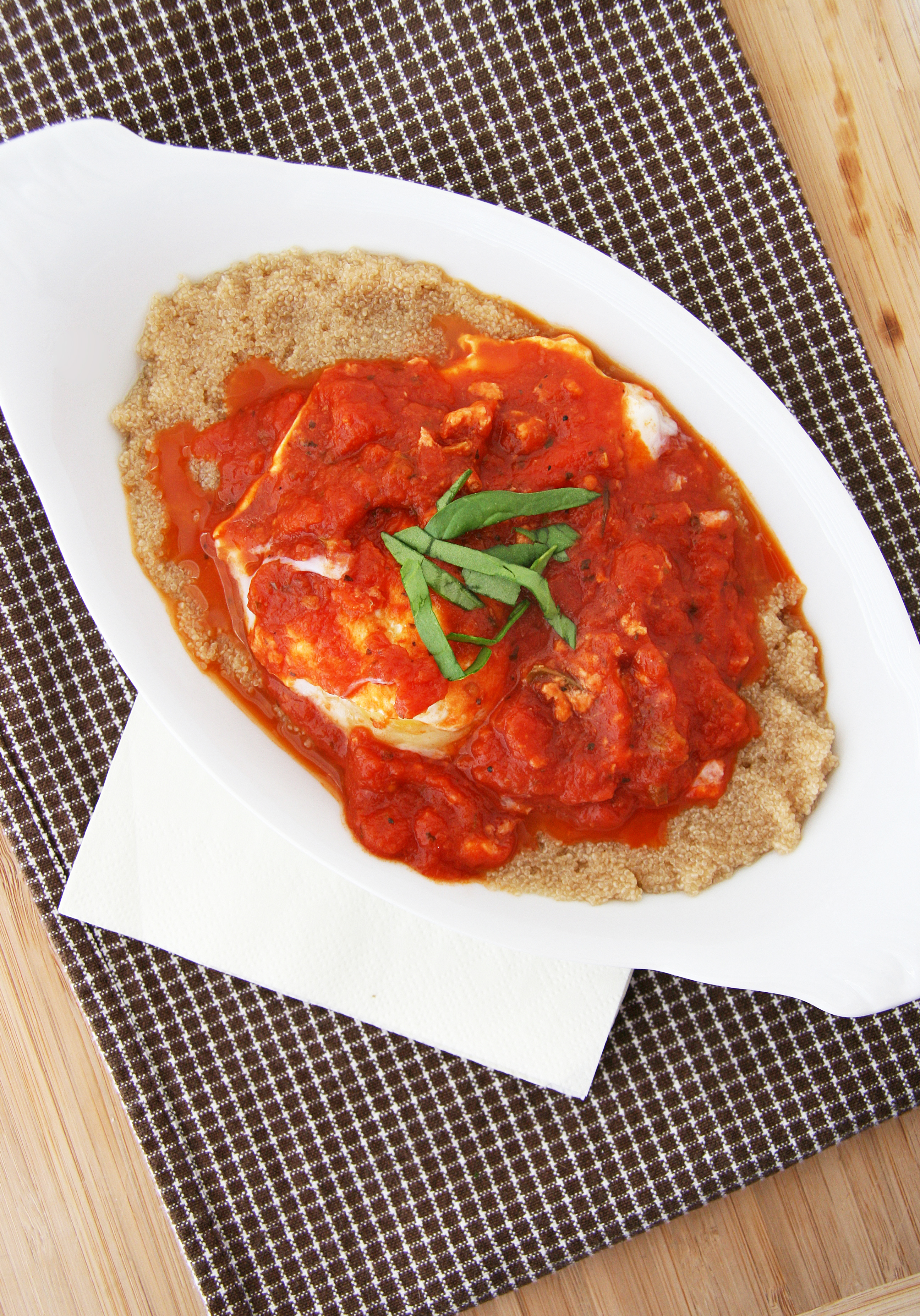 So what does a protein-packed, high-fiber breakfast with veggies look like in my world? Easy tomato sauce-poached eggs with cheesy amaranth grits. You could easily serve this for breakfast OR dinner as well. You could serve the eggs on a bed of cooked quinoa, millet, polenta or rice instead of amaranth if preferred. For all you morning toast lovers, these poached eggs could be served with slices of toasted whole-grain (and gluten free for me!) bread or english muffin.