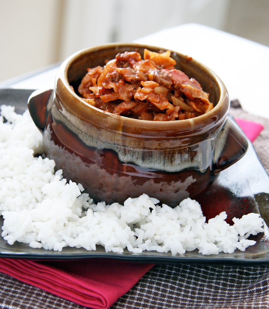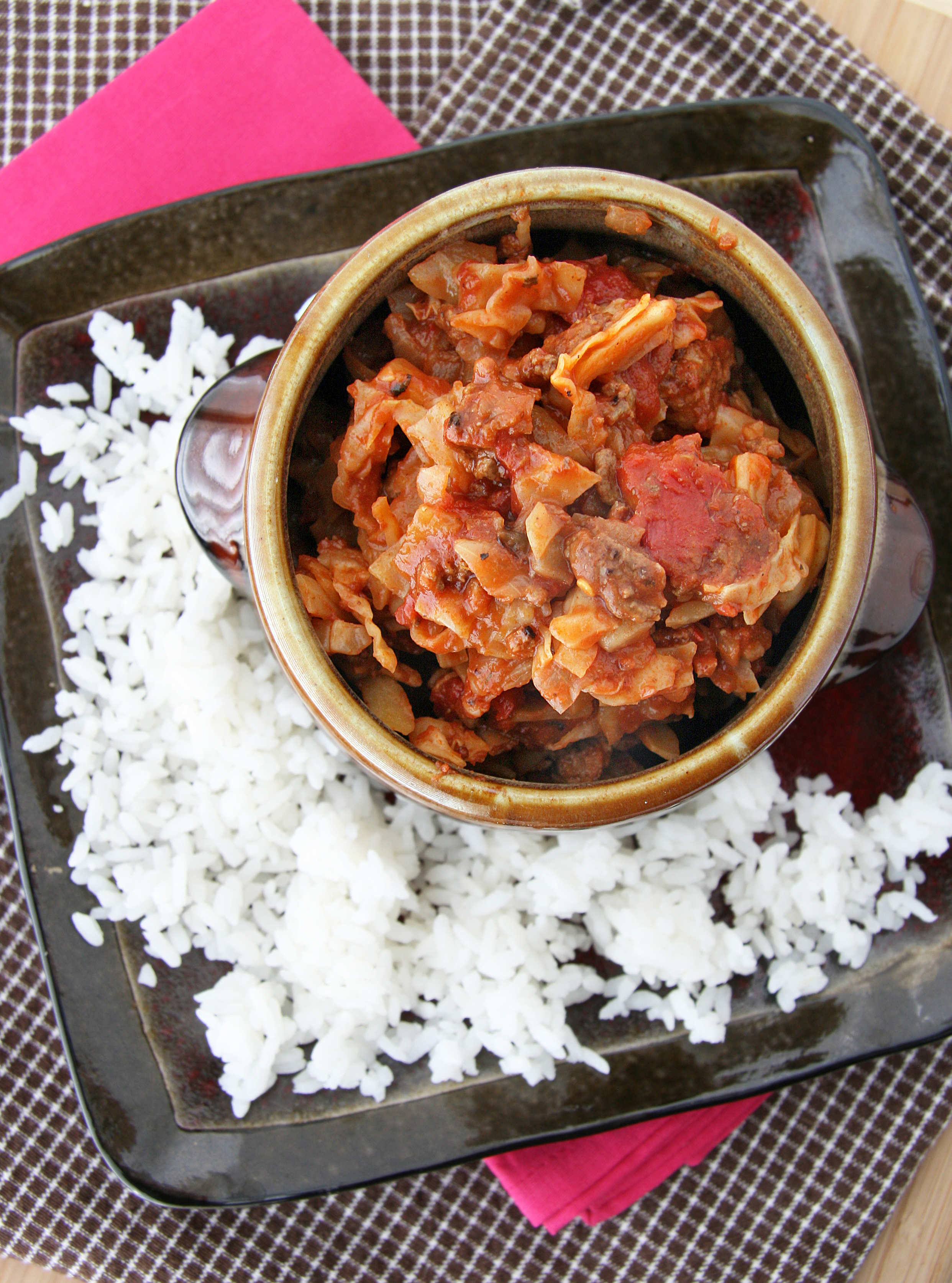 I bought a head of cabbage the other day with full intention of making ground meat and rice stuffed cabbage rolls. You know, the ones that are delicately prepared and baked in a tomato sauce and a little time-consuming. A couple days passed and I was running short on time last night and didn’t want to mess with the whole rolling, baking, boiling etc process. I didn’t want to have to freeze the meat to make the recipe at a later date so I came up with plan B – do I get bonus points for being flexible and thinking on my feet?!?