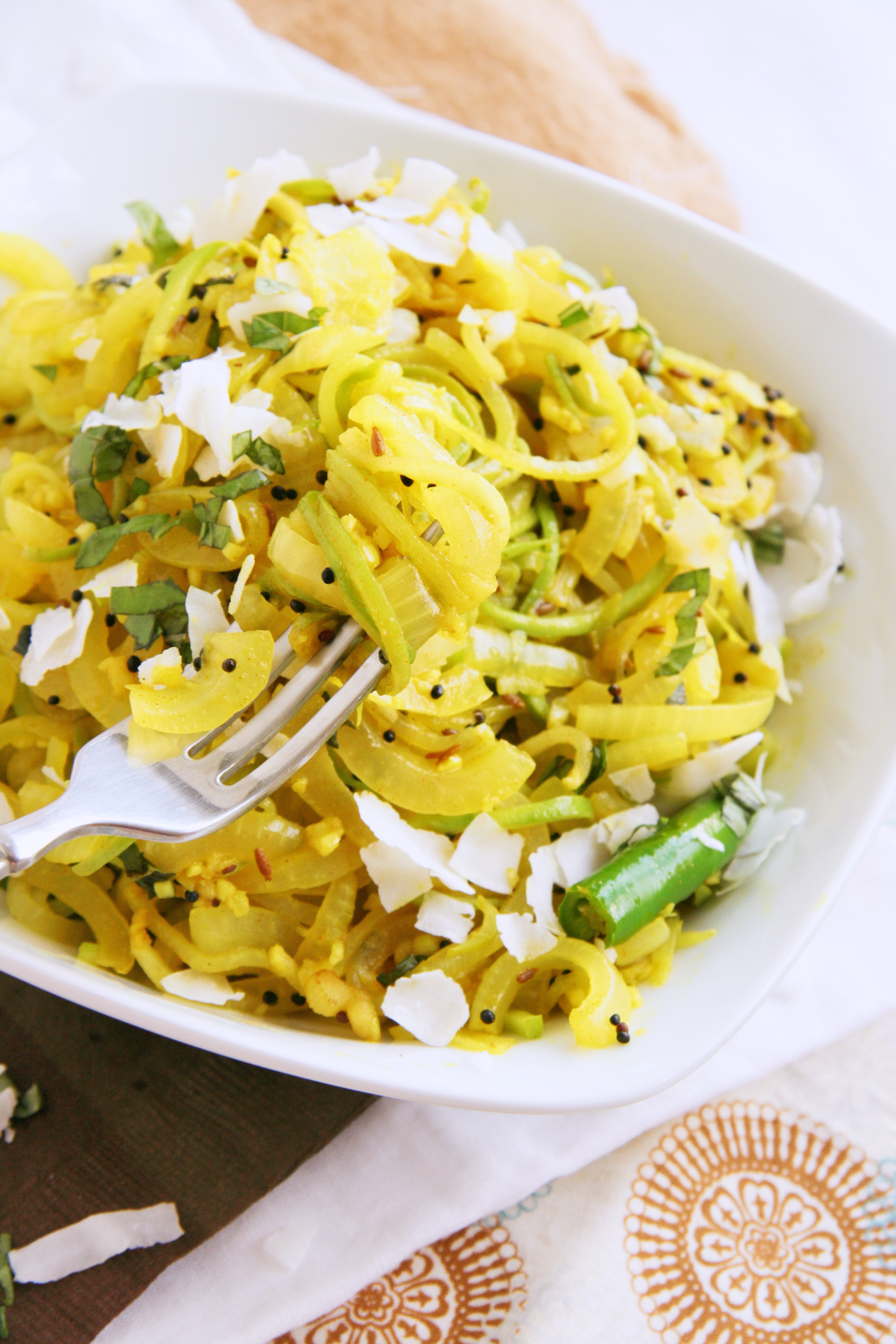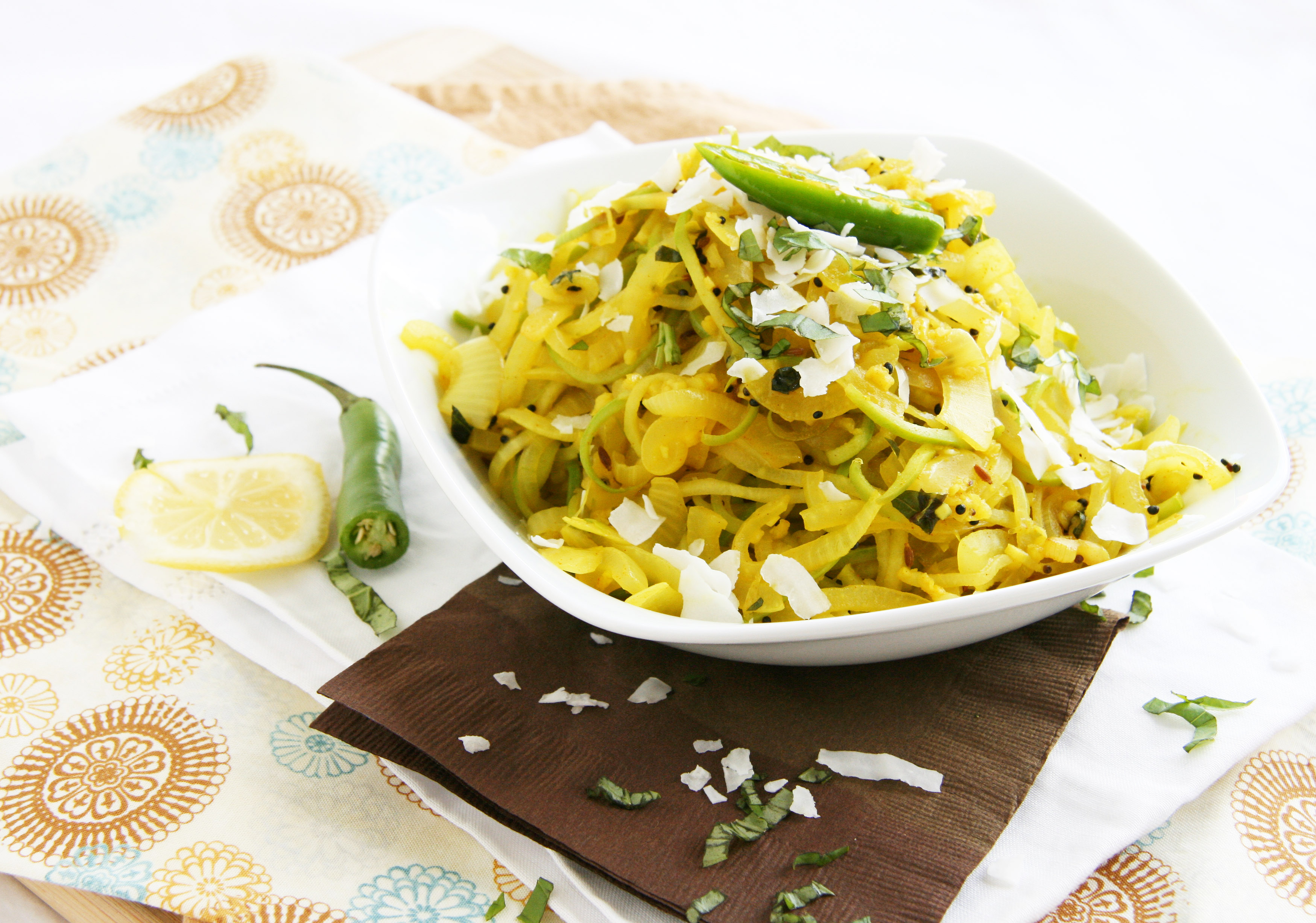 I made a few little changes to the original recipe…due to my infatuation with “spiralizing” food, I opted to create chayote spirals instead of grating. I couldn’t find curry leaves so I substituted fresh basil leaves with a splash of freshly squeezed lemon juice. I also made the swap of dried coconut in place of freshly grated based on availability in addition to a serrano instead of a green chili. Since I enjoy strong spices, I increased the amount of tumeric and coconut and threw in some cumin seeds just for fun. I’ll be whipping this quick recipe up again soon…could chayote be my new favorite food craze?