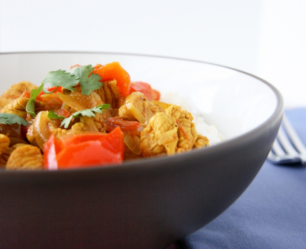 While I do eat beef occasionally (a couple times a month), I tend to favor fish, seafood, chicken and turkey over red meat. Aarti’s recipe for Beef Vindaloo was easily adaptable to a chicken variety. I decreased the amount of meat by a 1/4 (saves $) and I bulked up the mixture with fresh vegetables to add some color. Apple cider vinegar really brightens up the dish while my addition of coconut milk helps balance the acidity, though this is optional. I opted to mince a serrano pepper for extra heat but feel free to leave sliced in half and remove after simmering.