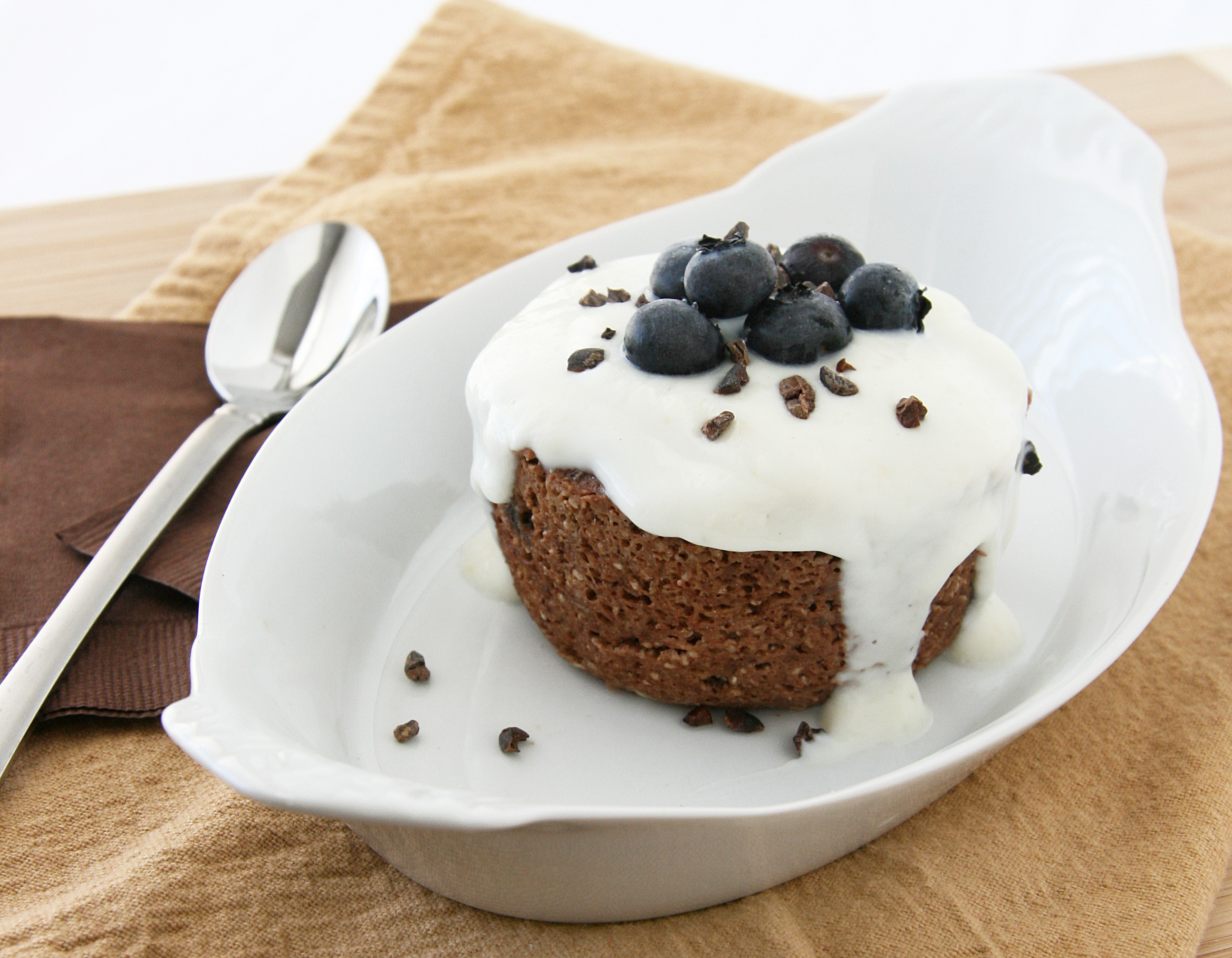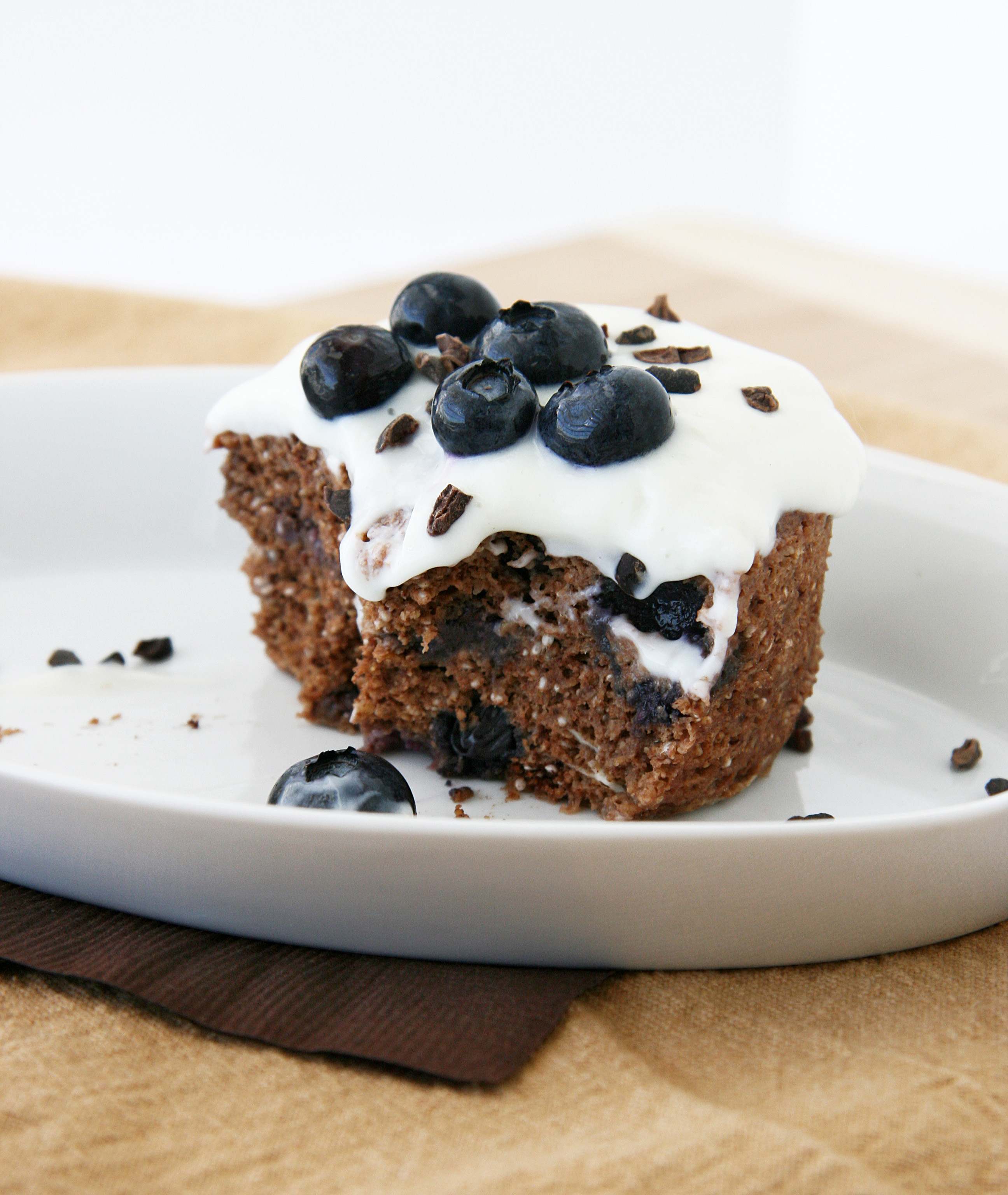 Yesterday, I wanted cake and I wanted it right then and there. No waiting around for it to bake, my patience wouldn’t hold out for that. To satisfy my dessert craving without going overboard on portion size, I whipped up a single-serving and instant chocolate cake studded with juicy blueberries and topped with a quick protein yogurt glaze.