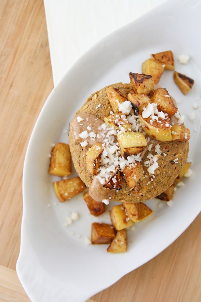 5. When bake is done, you can either serve in the ramekin/bowl or let sit for a minute or two them turn out onto a plate. Top with nut butter, cinnamon apples and coconut butter or coconut flakes and enjoy!