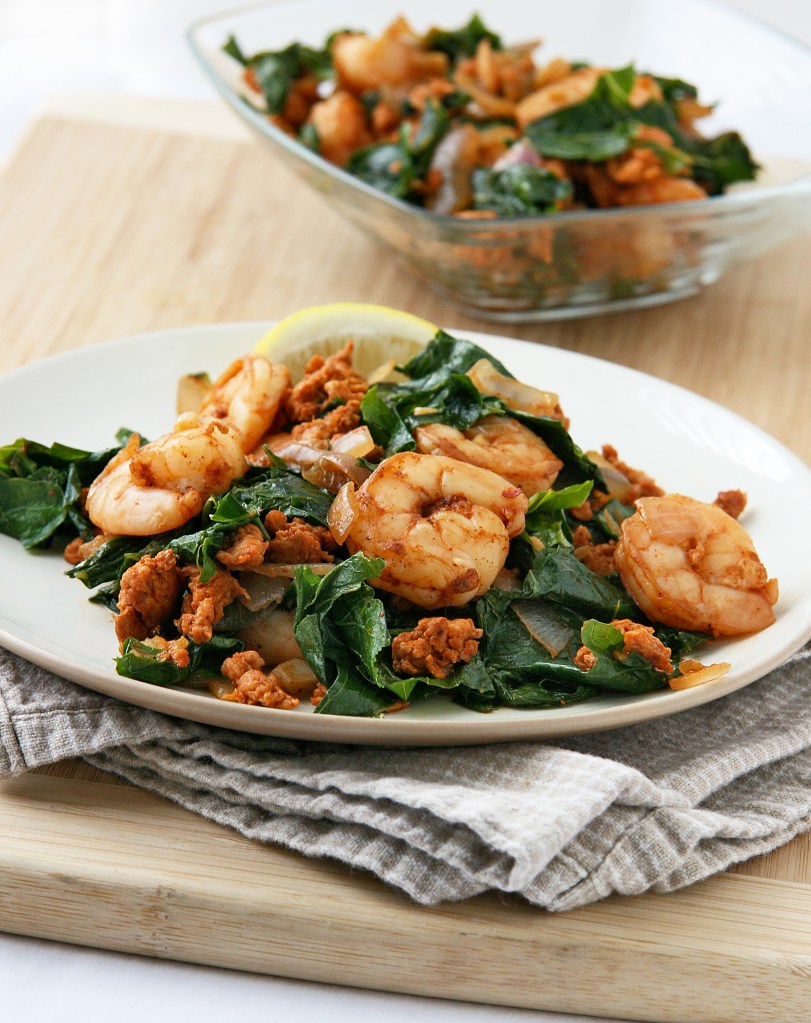I’ve adapted this dish from Collards with Turkey Sausage and Shrimp from the March 2010 edition of Clean Eating Magazine – it’s filling and hearty while healthy at the same time! I subbed fresh bulk turkey chorizo for regular sausage for extra spice and flavor but any sausage would do.