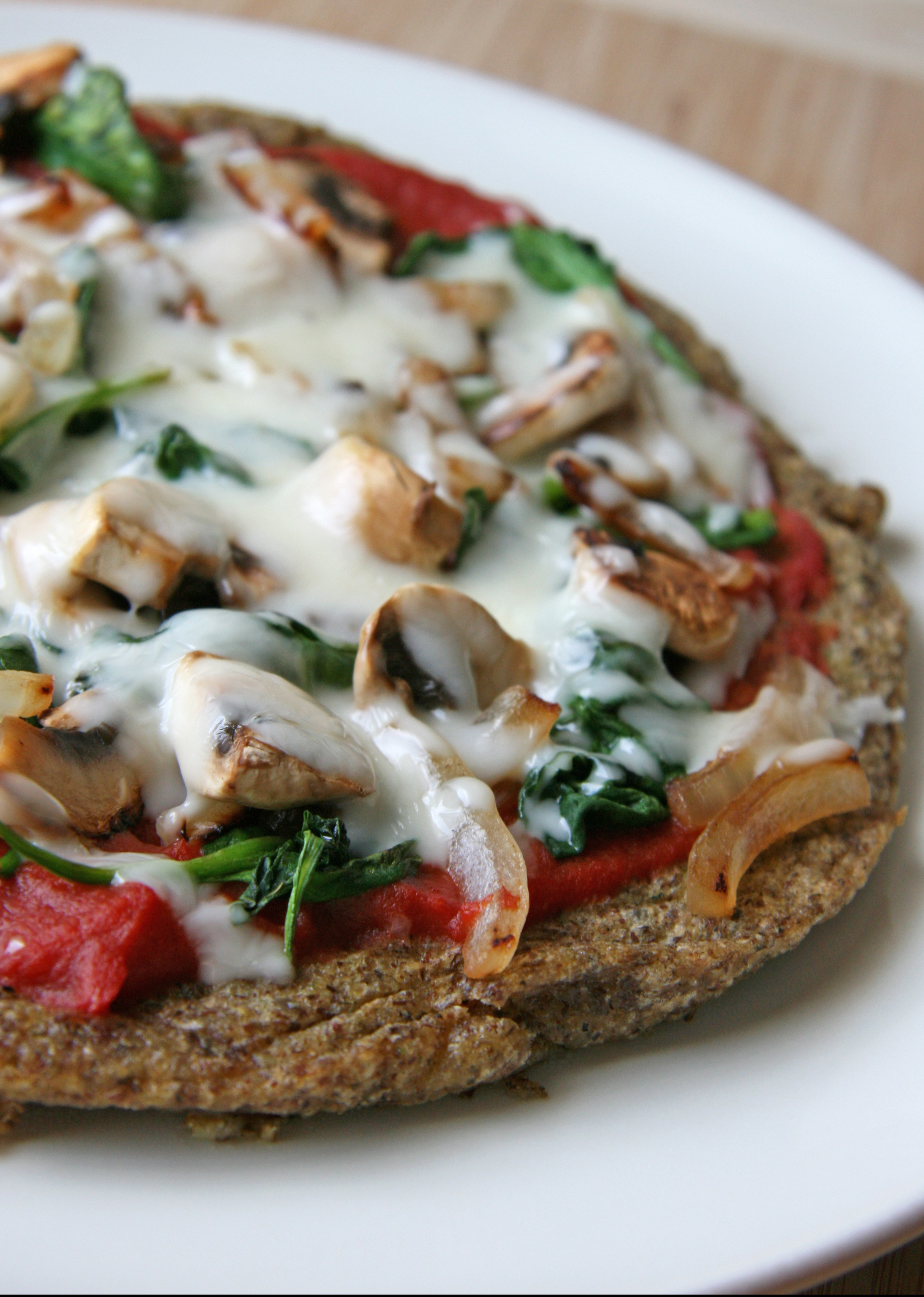 *I topped this pie with easy homemade tomato sauce (tomato paste with a dash of stevia and a couple tablespoons water and italian seasoning), caramelized onions, wilted spinach, sauteed tomatoes and some mozzarella! Easy as pie : ) Ok, that was a little corny…