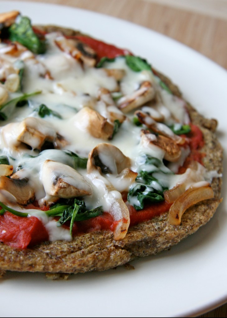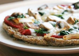 My all-time favorite combo is spinach, mushrooms, and onions with grilled chicken and extra tomato sauce – YUM! Trying to find a wholesome gluten-free crust that I can feel good about eating often can be tricky though. I’ll occasionally treat myself to a gluten free pizza at restaurants occasionally but they typically contain a ton of refined white flours (tapicoa, white rice flour, potato starch, etc) and are quite pricey — I ordered one from our local pizzeria the other night with 3 toppings for $32!!!
