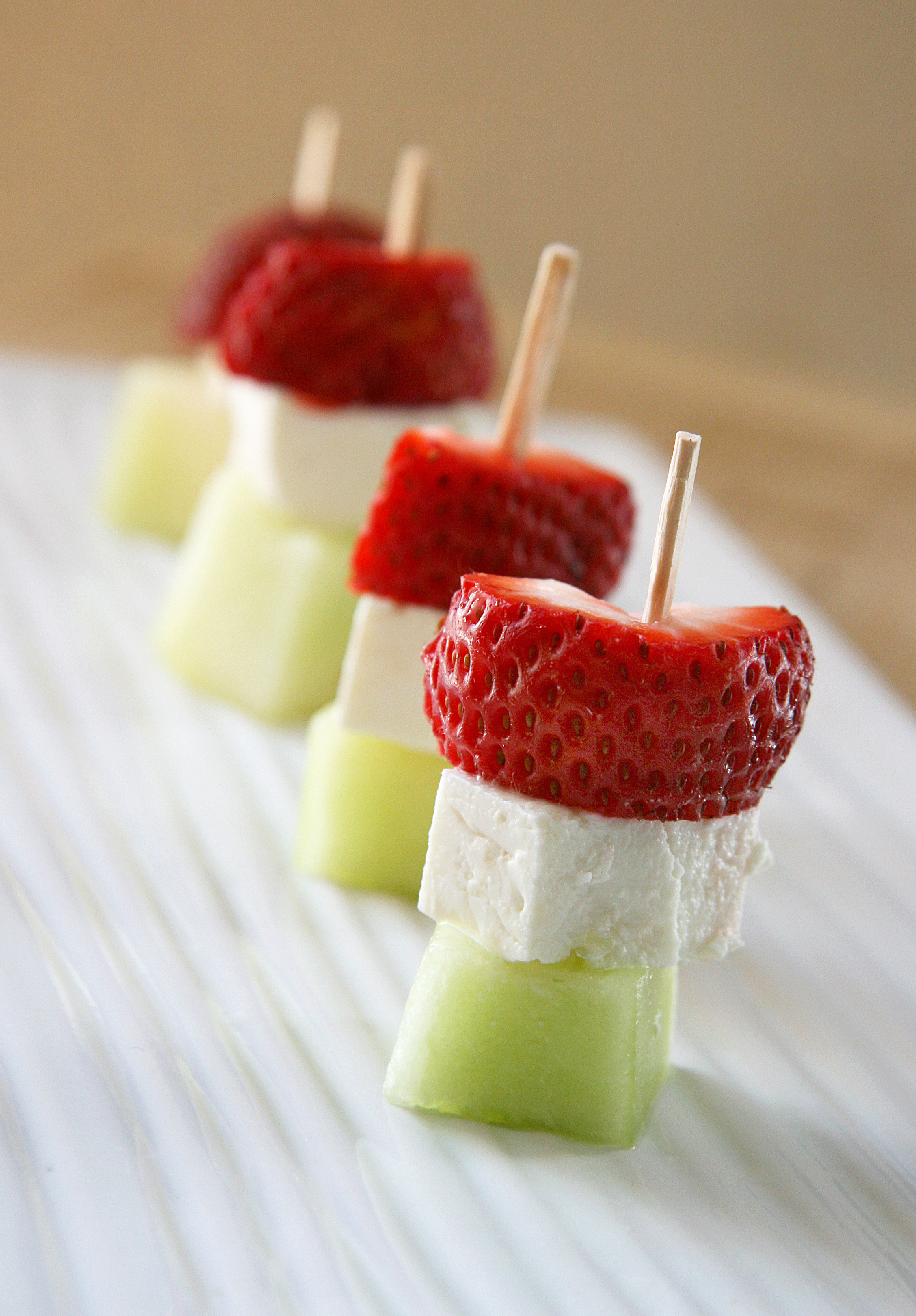 Salty and sweet. Quick and easy. Pure and simple — all great combos that describe this bite-size snack or appetizer. This mini salad-on-a-stick is perfect for the summer when melons and berries are in season! Drizzled with a touch of lime (or lemon) juice, these ingredients are far from being complicated and come together for a delicious bite that is both refreshing and colorful! I can hardly call this a recipe but at least this might spark some ideas for others 🙂