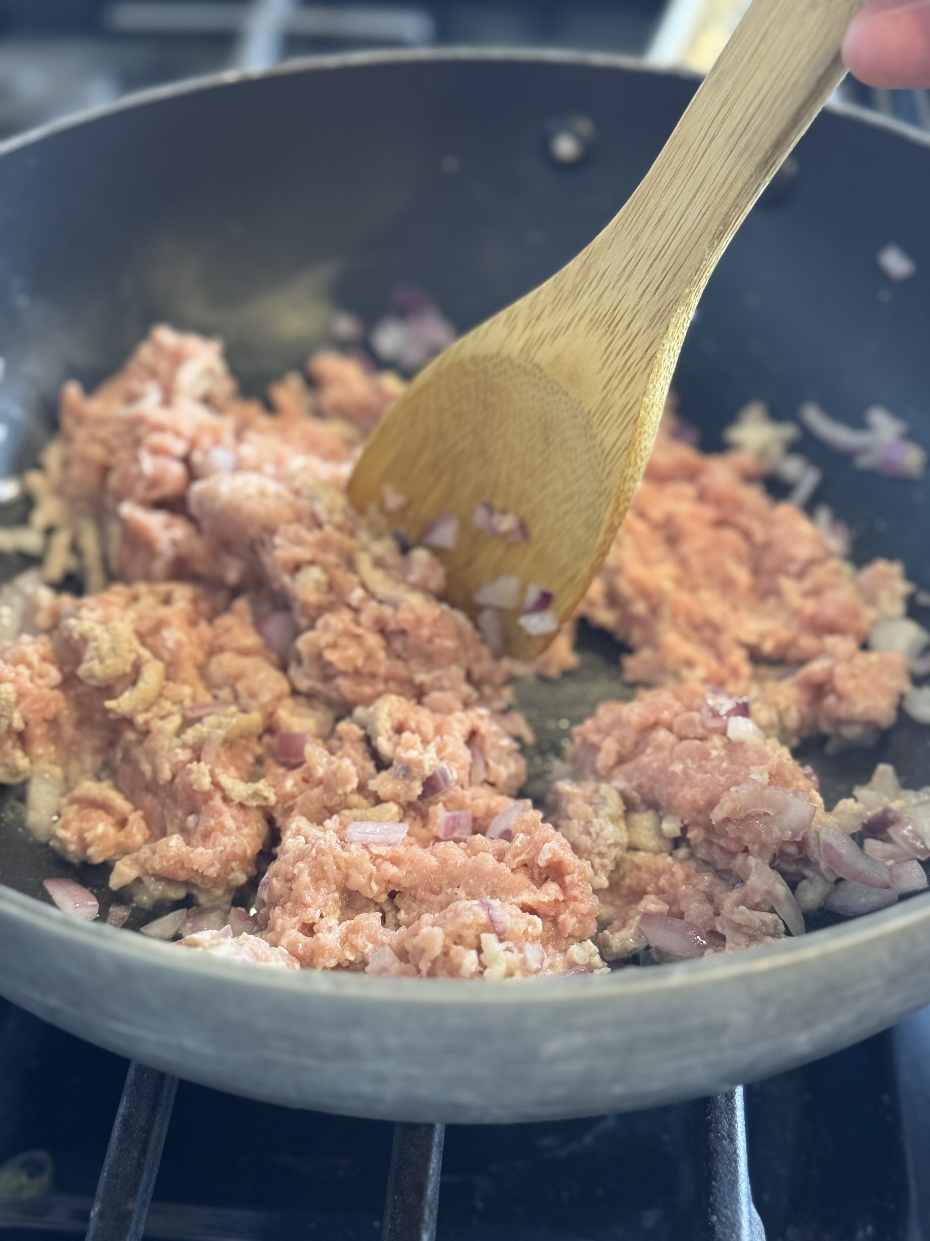 Cook the Turkey and Aromatics: In a large wok or skillet, heat 2 tsp oil over medium heat. Add diced onion, minced garlic, and ground turkey. Sauté until the turkey is mostly cooked through, breaking it up as it cooks (about 5-6 minutes).
