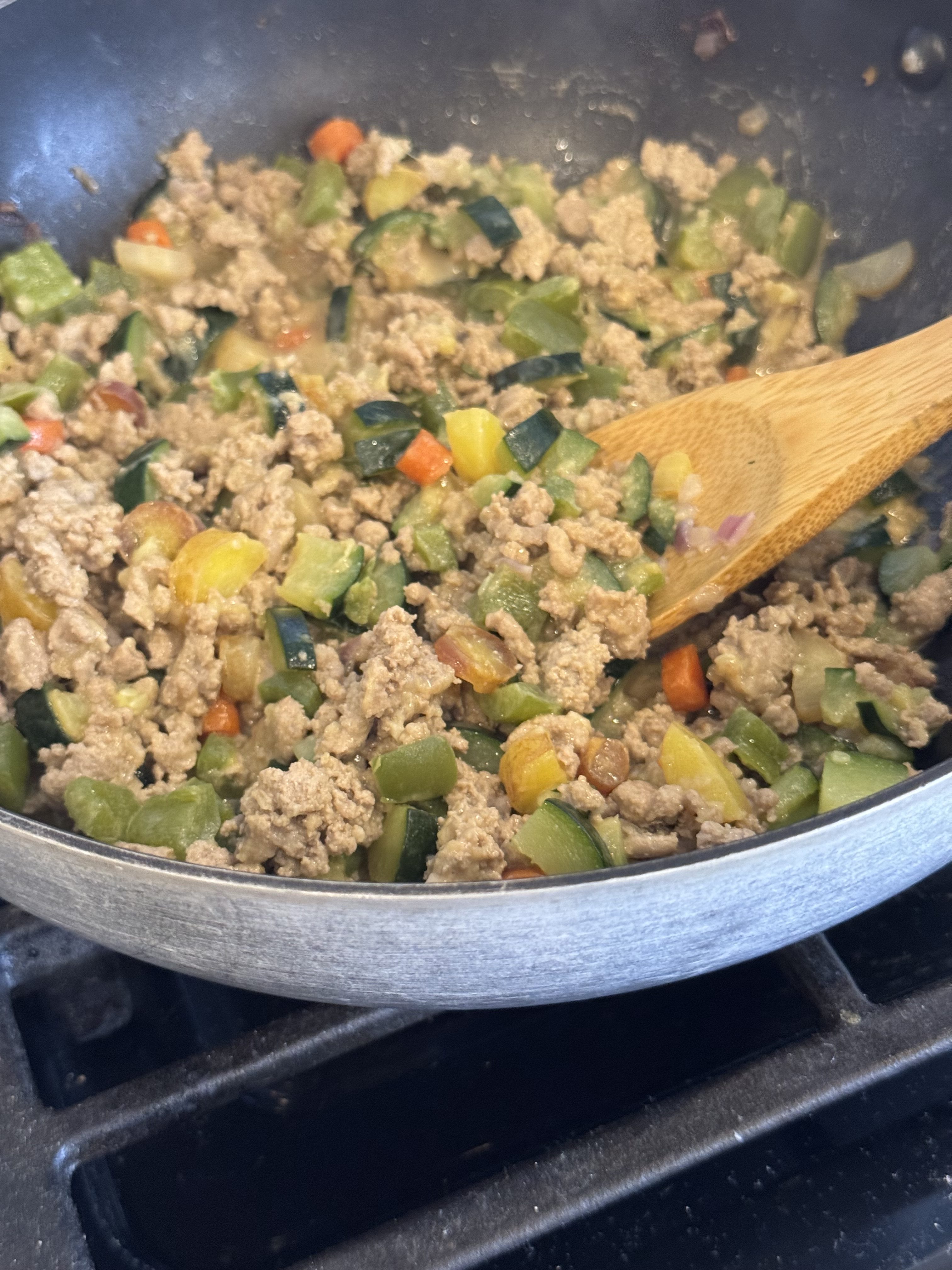 Combine: Uncover the skillet, pour in the sauce, and stir to coat the turkey and veggies. Raise the heat to medium and cook for 2 minutes until everything is warmed through.