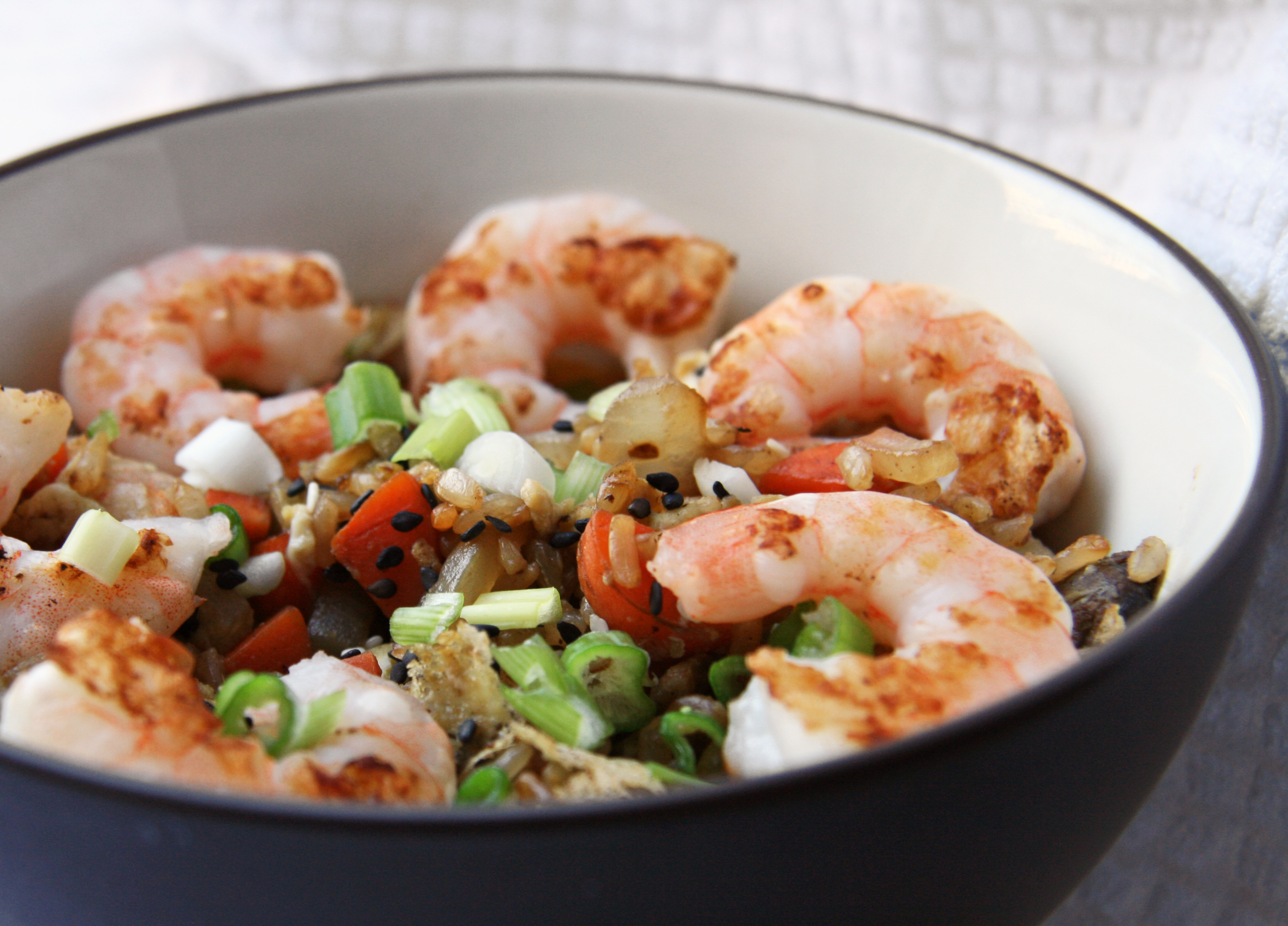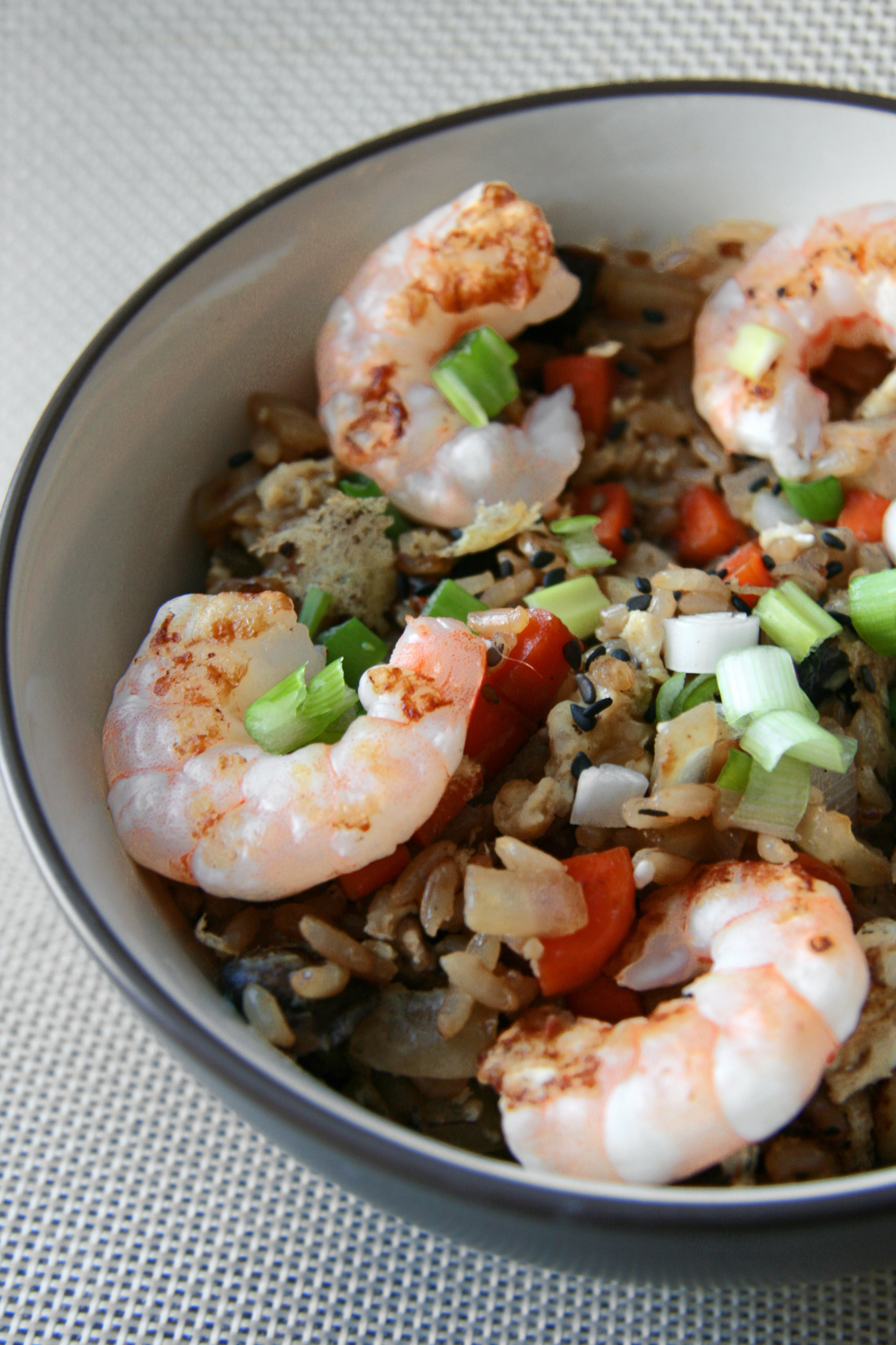 - 2. Add remaining 1/2 tbsp oil to the pan and add chopped onion and carrot, stir and cook for about 3 minutes. Mix in green onion, rice, sesame seeds, ginger and soy sauce and cook for another 2 minutes, stirring frequently. Add shrimp back to pan.
