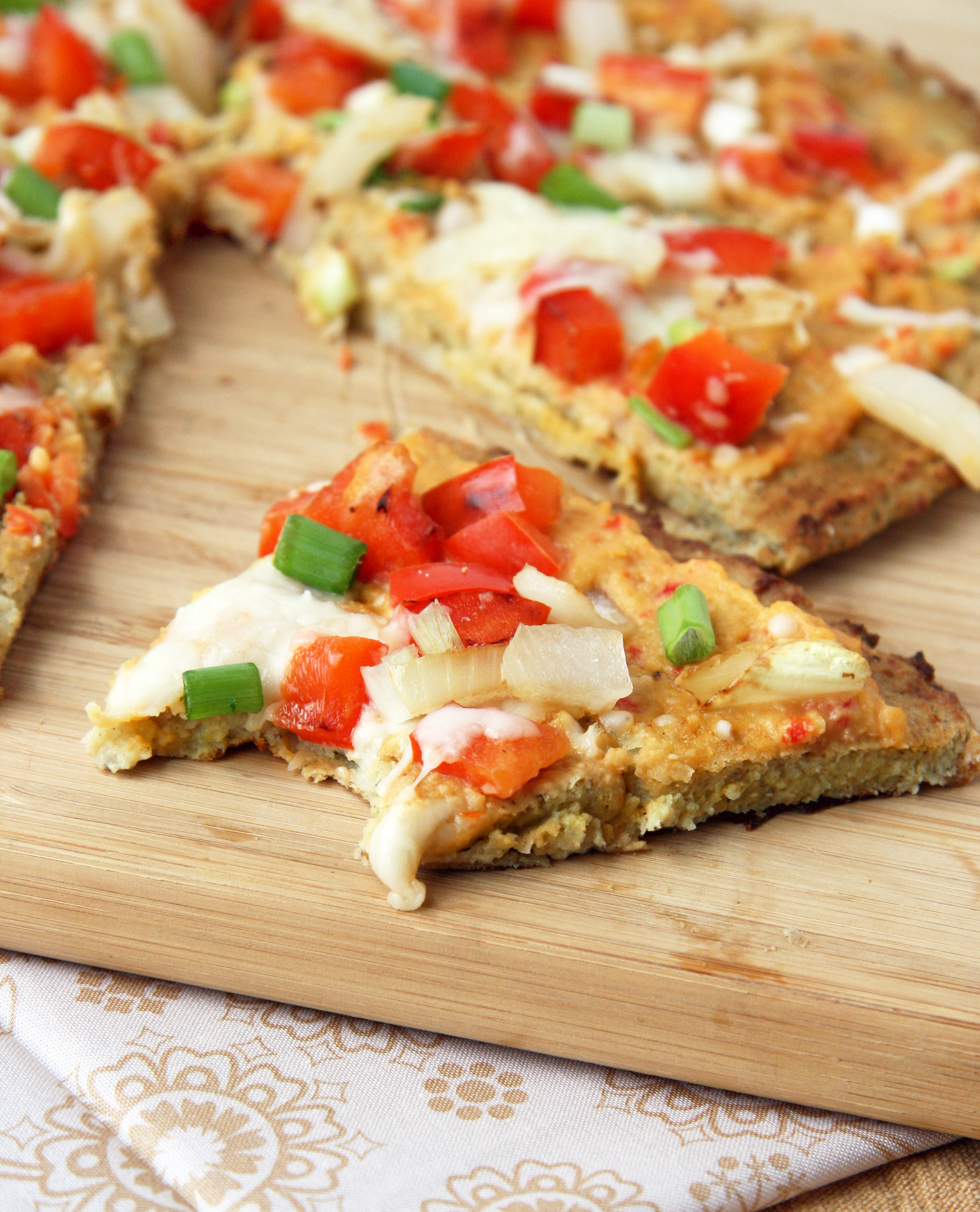 Onto my 2nd recipe during pizza week, I present to you lower carb cauliflower pizza crust with kickin’ roasted red pepper hummus and lots of veggies!