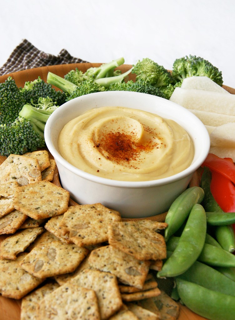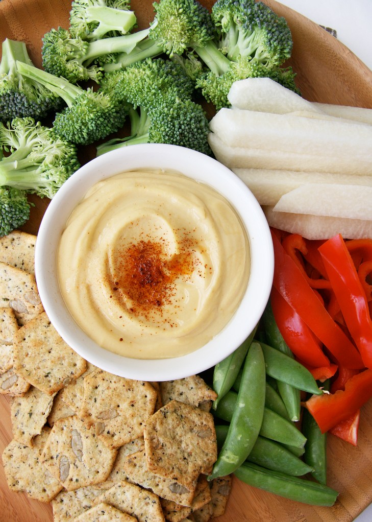 I served this hummus with cut up vegetables (broccoli, red bell pepper, snap peas, and jicama) and Chris enjoyed his dip with Back to Nature’s Sunflower Basil Crackers (not gluten-free) but pita bread, chips or other chip make a perfect pairing too. Hummus is also a great high-fiber substitute for mayo or sandwich spreads, as a non-traditional sauce for pizza, used in my 3-ingredient healthy deviled eggs, as a binder in burgers and as a topping for cooked meats, veggies or breakfast bakes.