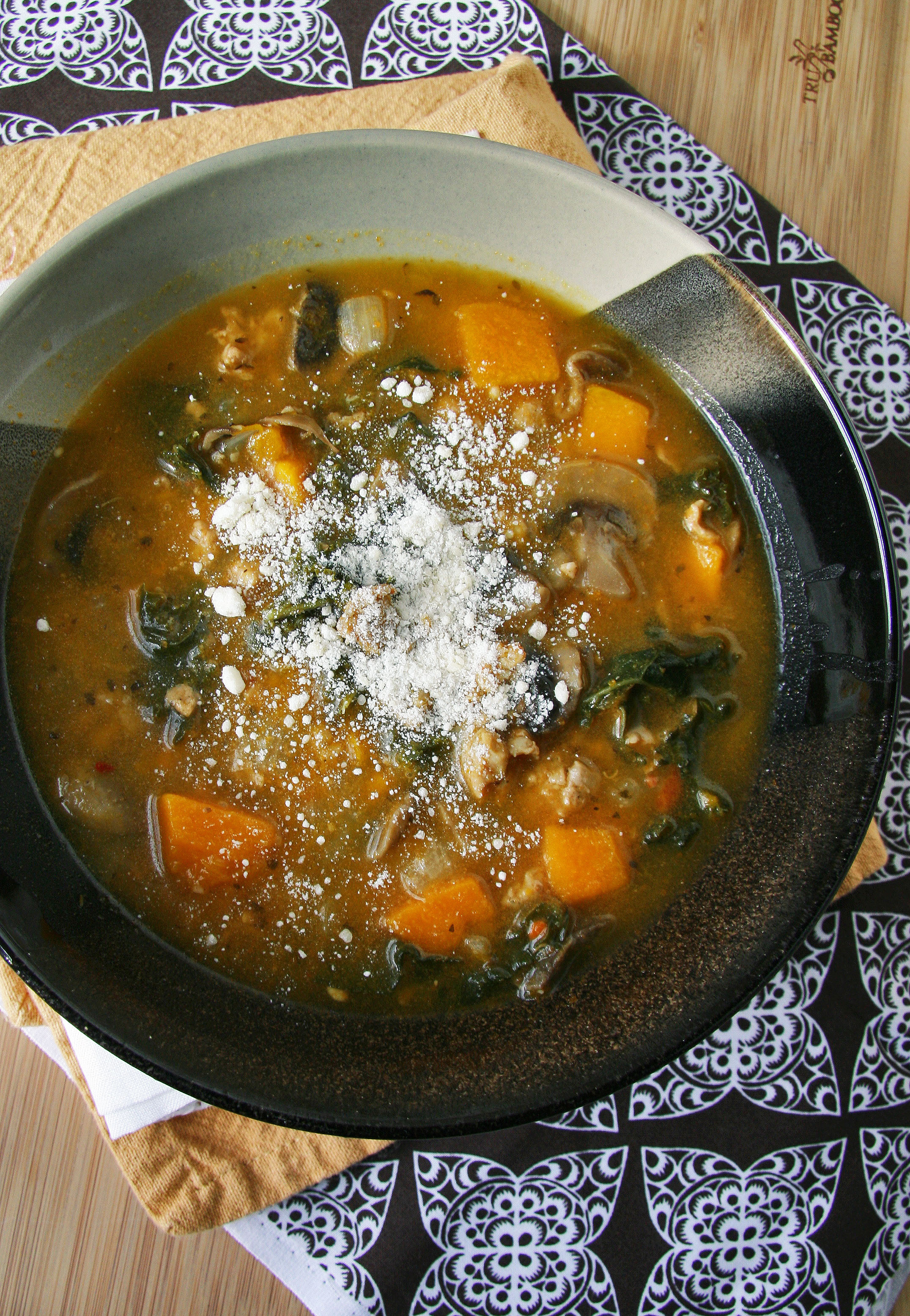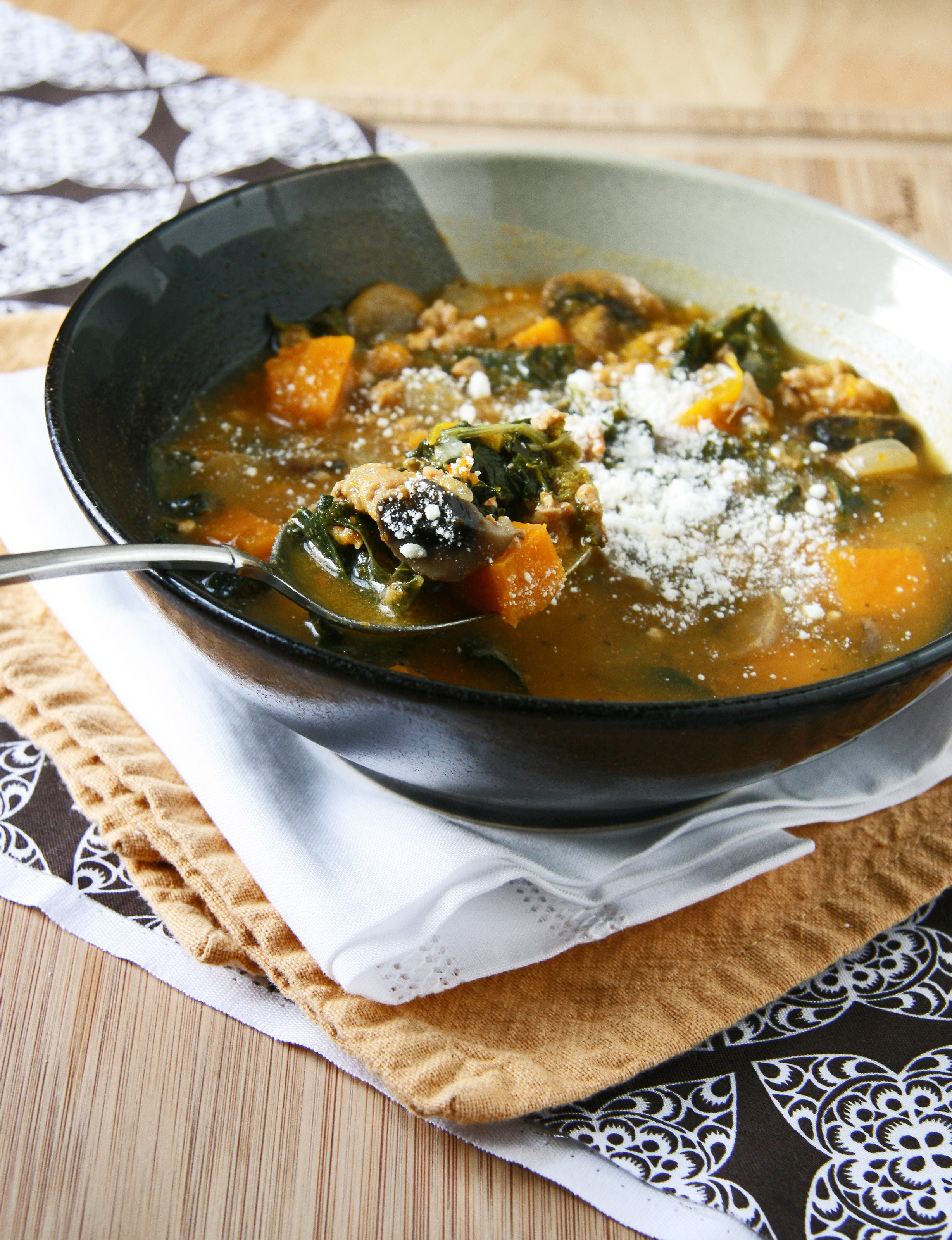 This soup is filling and easy to make on a weeknight – hearty greens, spicy italian sausage and sweet winter squash come together for a quick and delicious meal that warms you to the core. The grated parmesan adds a delicious complexity to the soup that I highly recommend as a finishing element…everything is better with a little cheese, right? 🙂 If you need to omit for allergy reasons though, this soup is still delicious!