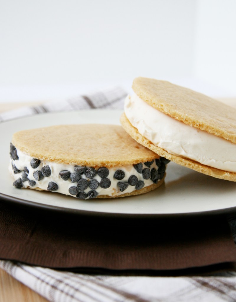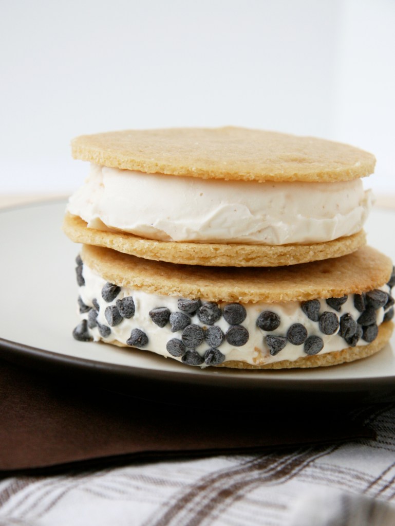 When cookies were completely cool, I used a slightly smaller biscuit cutter to form the “filling” out of the peanut butter ice cream — this is where the shallow container comes in handy when storing the homemade ice cream. I placed the filling between two cookies and created two large ice cream sandwiches. One I rolled in mini chocolate chips for variety but crushed nuts, sprinkles or crushed toffee would all be pretty. Then I froze the sandwiches to reharden a bit until it was time for serving 🙂 These received rave reviews!