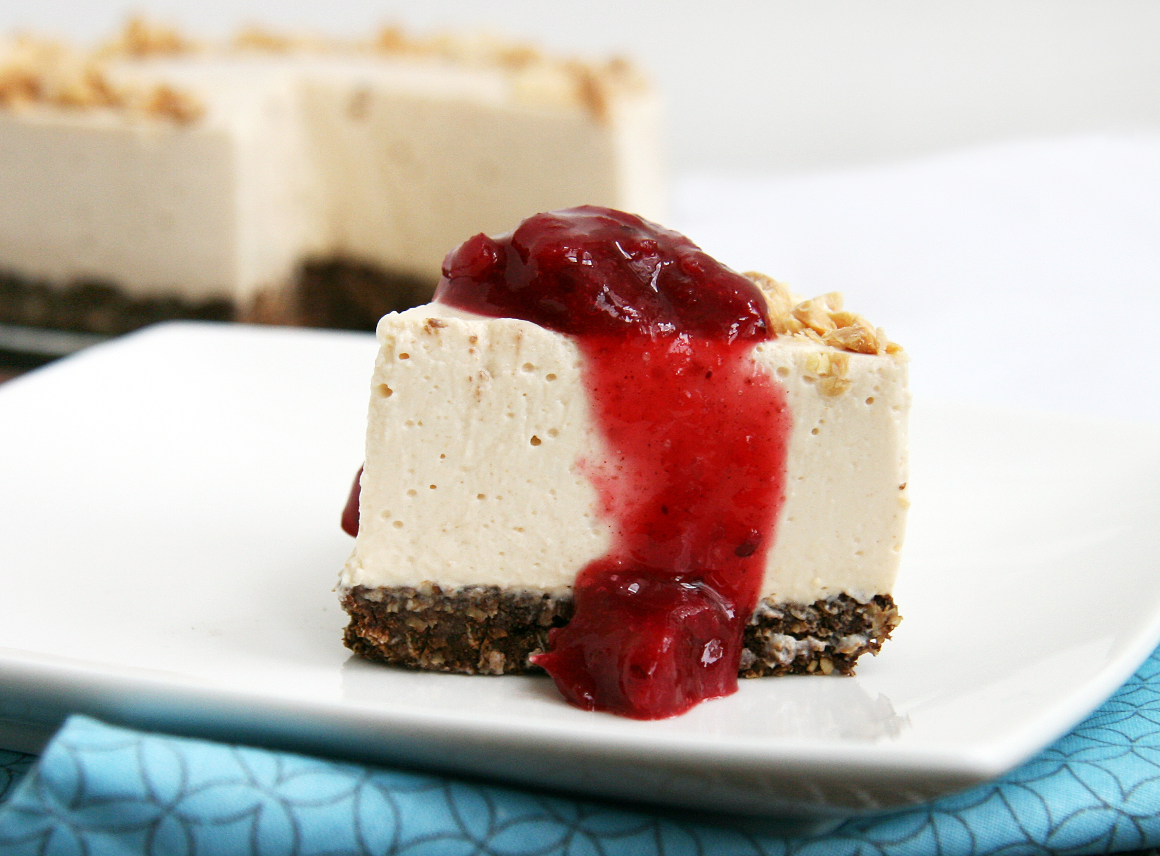 - Pour over prepared crust and let chill in the refrigerator for 4 hours up to overnight (or until set). Remove sides from spring form pan carefully, garnish with chopped nuts and serve with compote if desired. Enjoy!