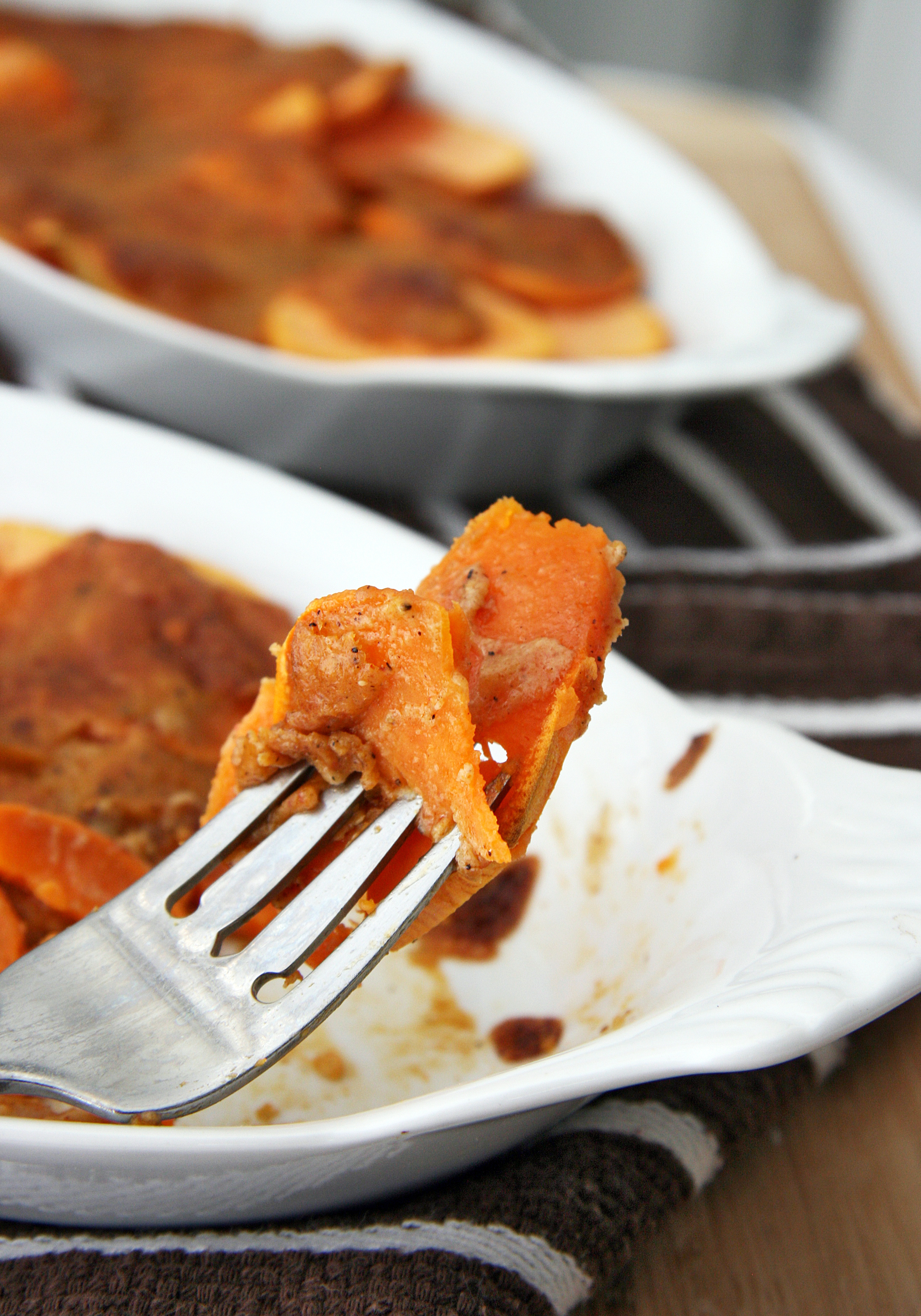 Spicy Scalloped Sweet Potatoes (adapted from Clean Eating “Classic Comfort Foods”)