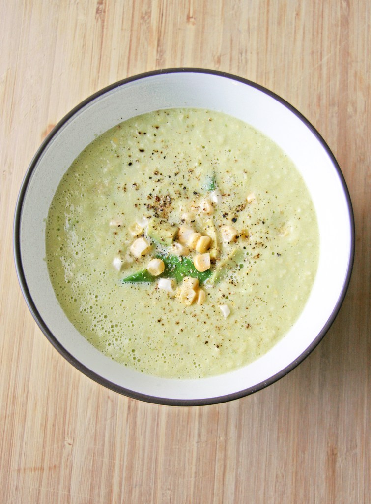2. Transfer kernels, corn “milk” and pulp to a blender. Add remaining ingredients and blend for 1 minute or until well combined. Pour in bowls, garnish with the set-aside corn kernels along with desired toppings (I sprinkle mine with ground pepper, chunks of avocado and a bit of diced jalapeno) and serve immediately, or you can chill until ready to serve. Leftover soup will keep for about two or three days.
