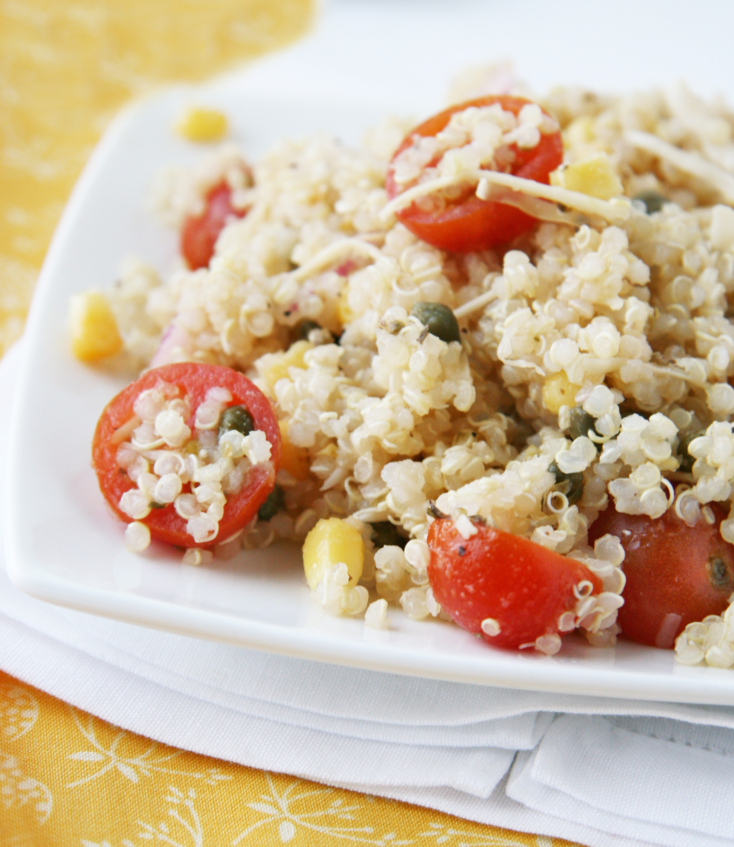 This yummy quinoa salad won me over! Juicy tomatoes, fresh corn and bright lemon juice pair really well with the nutty quinoa and salty capers and cheese. I served this “salad” as a delicious light lunch with a green side salad. If you are looking for a healthy make-ahead dish that can be served chilled or at room temperature, give this a go. If you want an added protein boost, feel free to add cubed chicken, cooked shrimp or tempeh for a quick one-dish meal.