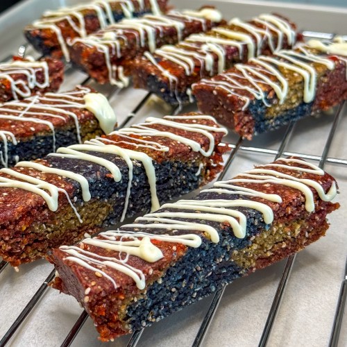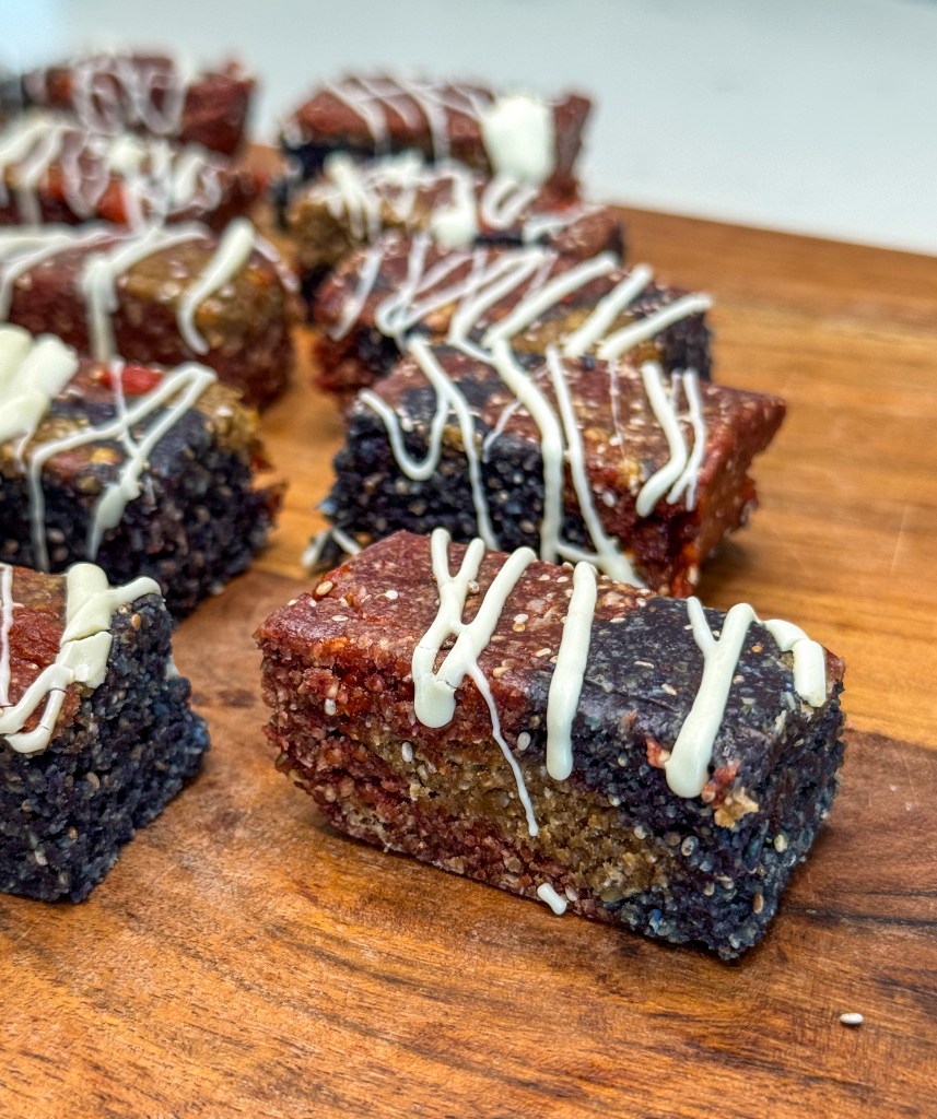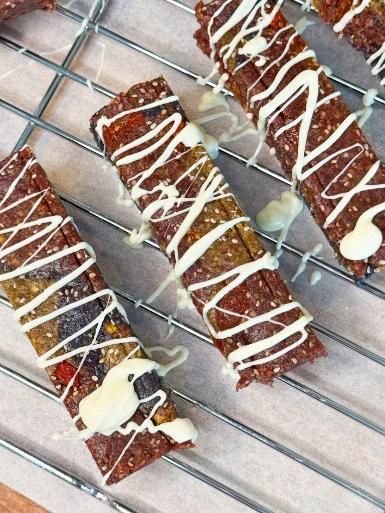 - Drizzle over the chilled bars using a spoon or piping bag. If desired, sprinkle extra goji berries on top for added texture and color.