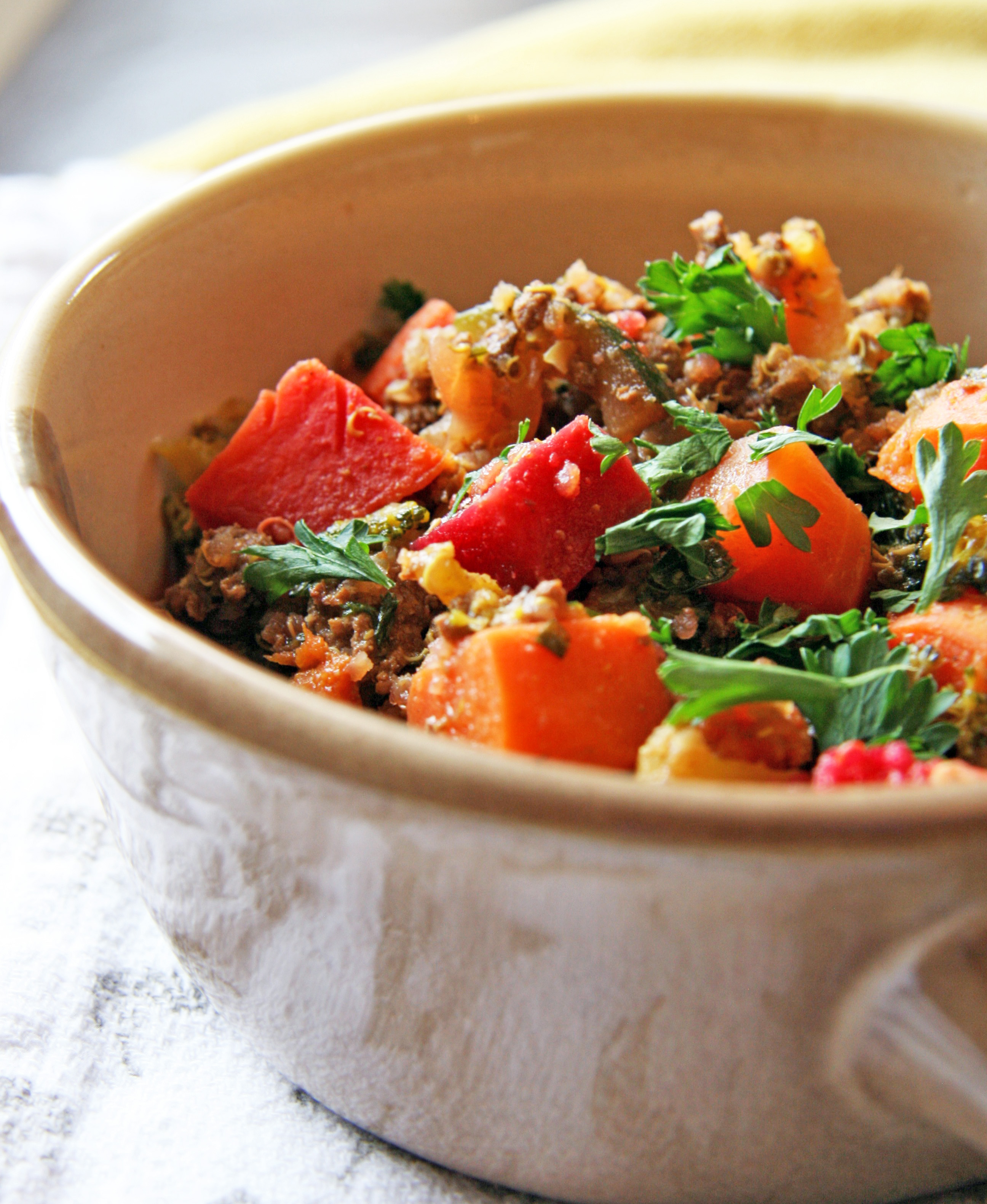 That means it’s chili, stew and soup season! The first to make an appearance is this warm-spiced stew with ground emu and an array of sweet roasted root vegetables. Not only is this recipe easily adapted for what veggies and ground meat you have on hand, it’s a lovely pairing of sweet, salty and comfort with a variety of textures where you can swap out ingredients to suite your dietary needs. The root veggies compliment the shawarma spices and the ground meat beautifully, the apple cider vinegar makes the flavors really pop and the quinoa and mushrooms add to bulk and “meatiness” of the stew.