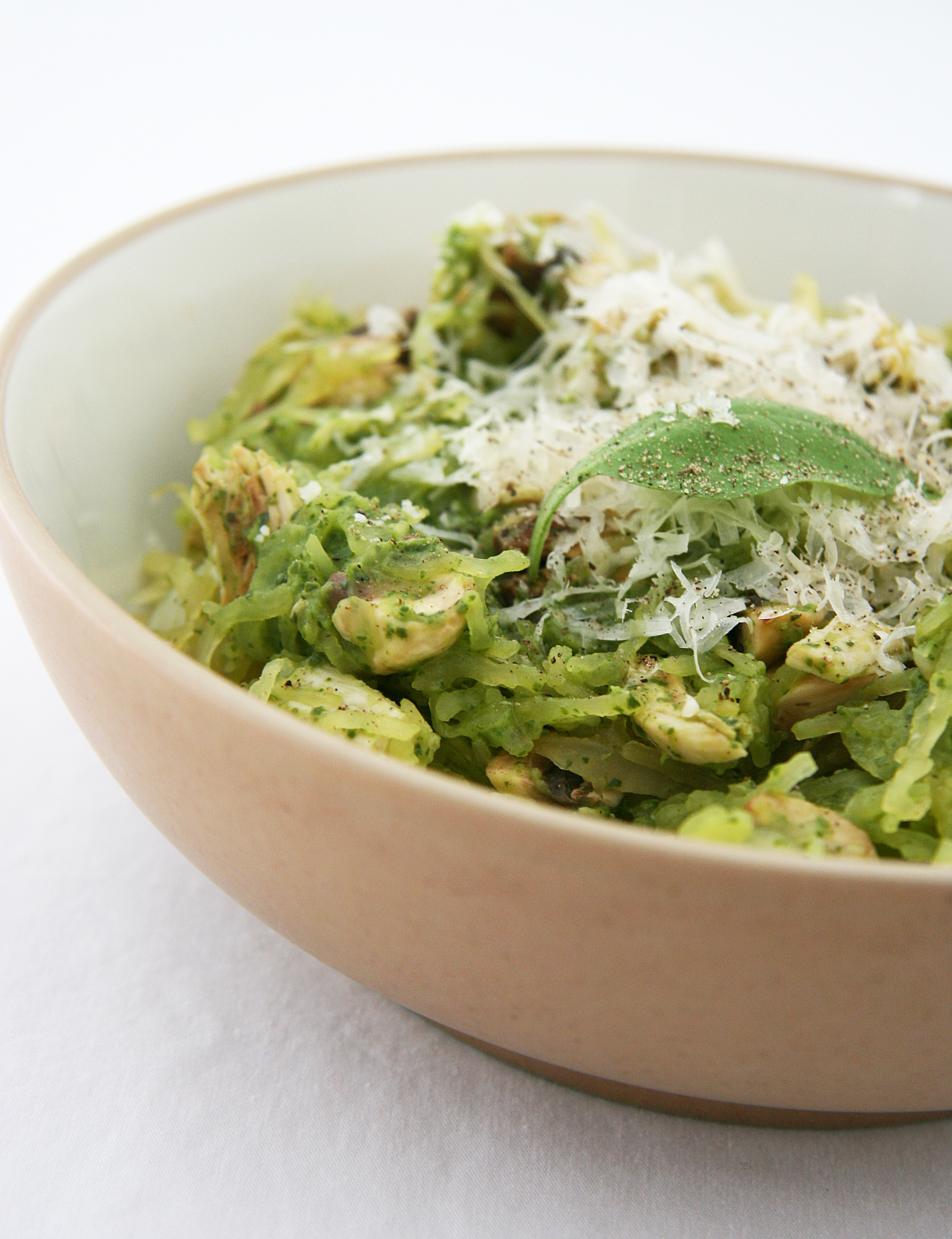 I discovered spaghetti squash about 6 years ago when my mom served it as a bed for her delicious meaty pasta sauce – I love the slight sweetness it brings to a dish and the long spaghetti-like strands fascinate me. Since my initial encounter, I’ve made spaghetti squash numerous times, incorporating it in a veggie-packed lunch tossed with my arugula and spinach pesto, sauteed chicken and mushrooms or a hearty dinner with my turkey meatballs and spinach sauce and of course more parmesan cheese 🙂