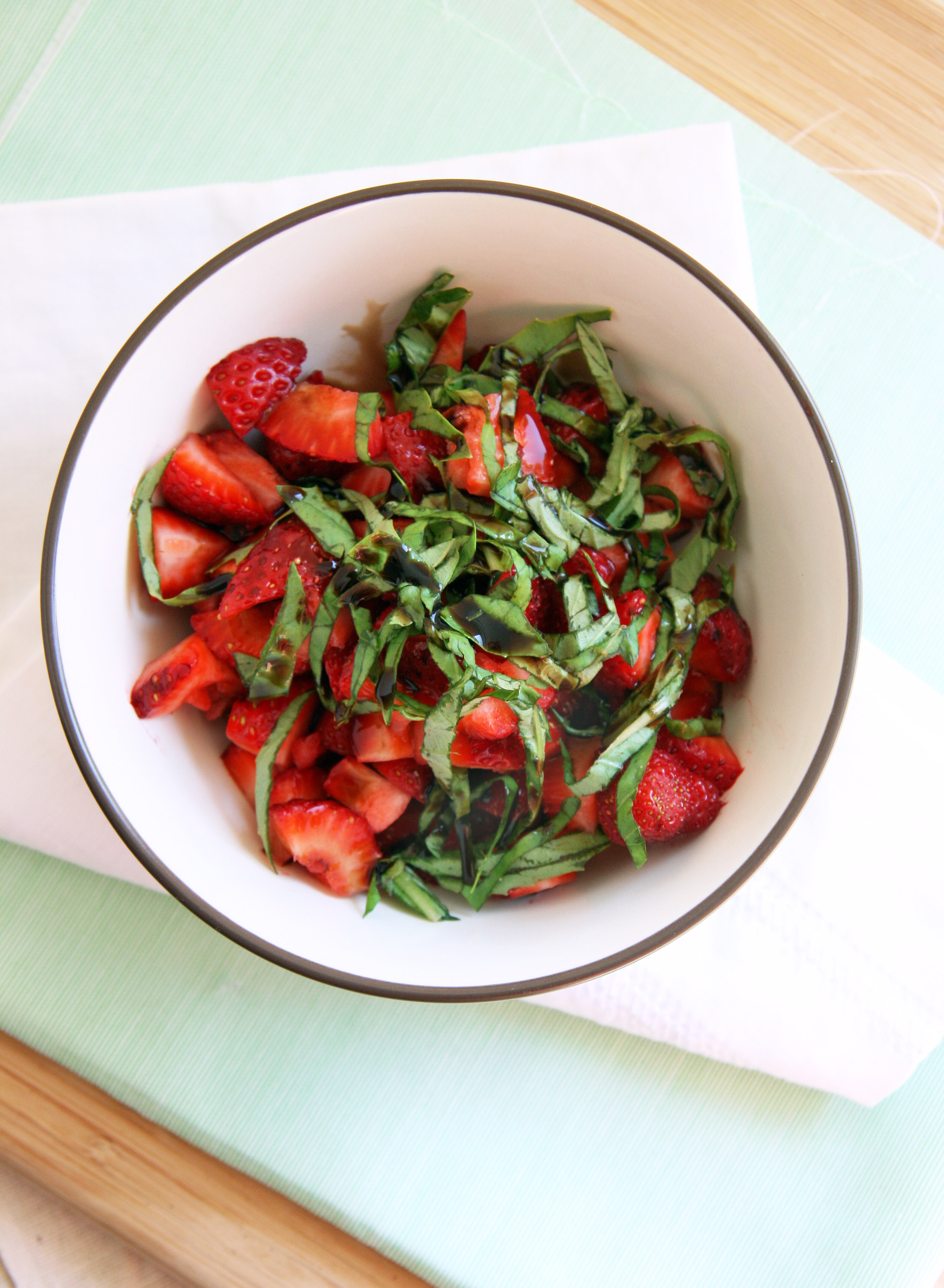 - Combine the strawberries, basil and balsamic vinegar in a bowl and mix well.