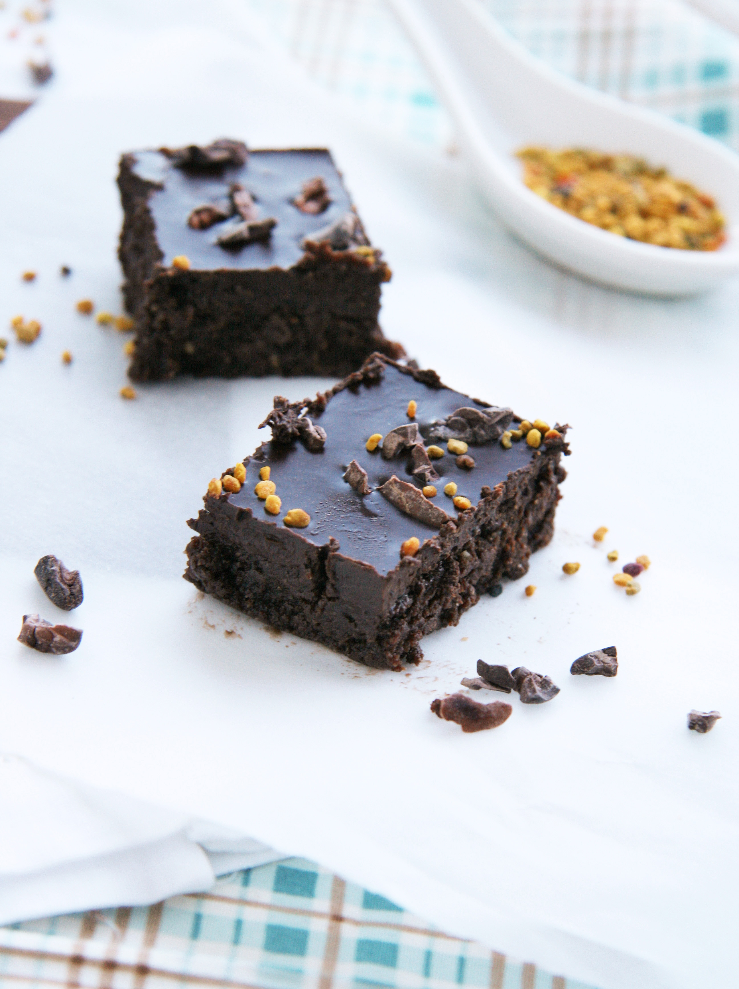Raw…chocolate…amazingness! These little fudge squares are choc-full of healthy fats, superfoods and FUDGY flavor. A raw brownie base with a thick chocolate ganache is then sprinkled with local bee pollen and crunchy cacao nibs for a fun flair.