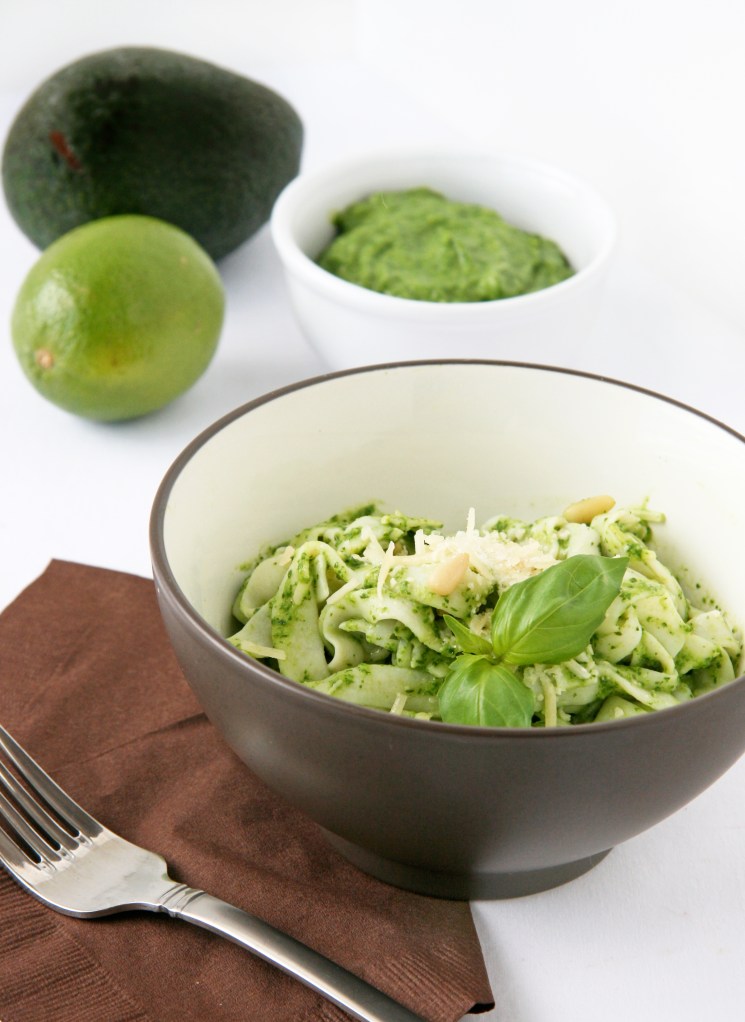 2. While pasta cooks, use a spoon and scoop out the flesh from the avocado and place in a food processor. Add the spinach, arugula, basil leaves, lime juice, garlic, pine nuts, salt, and pepper. Blend until smooth.