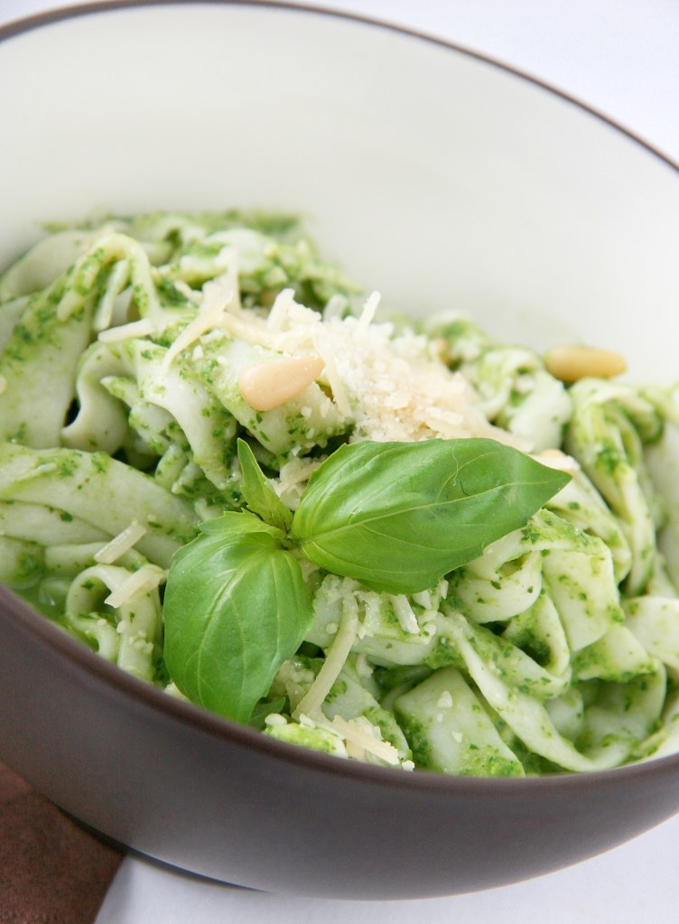 3. Pour the pesto over the pasta and toss together. Add the cheese and toss together until coated, adding the pasta water a little at a time as needed, to loosen the sauce (I only needed a couple tablespoons). Garnish with additional cheese, pine nuts and basil, if desired, and enjoy!