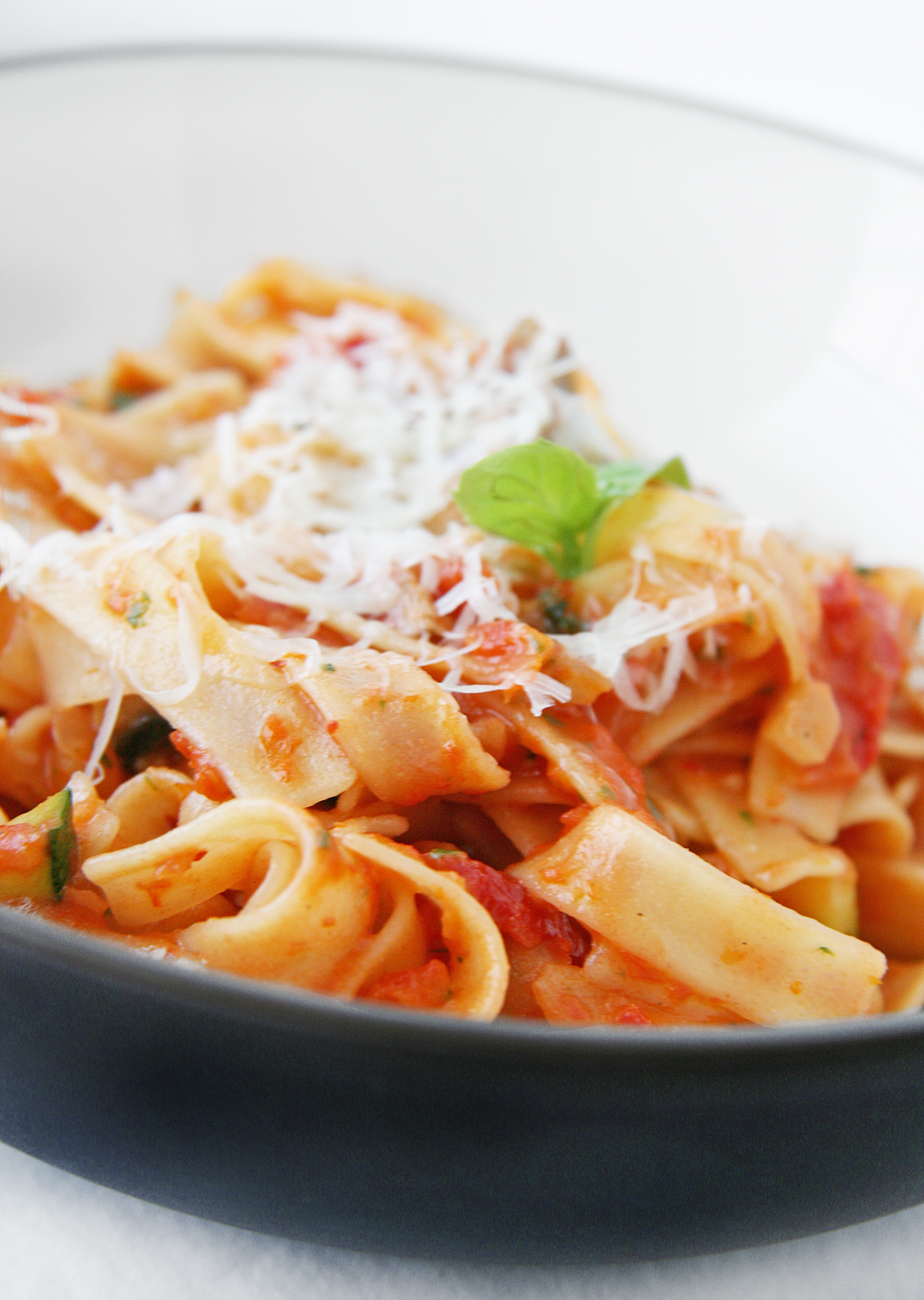 For the second pesto recipe, I couldn’t wait to use incorporate the delicious sun-dried tomatoes that I received a week ago! These tomatoes have such a wonderful sweetness that pairs perfectly with fresh garlic, basil and good-quality olive oil. I made mine a little chunky on purpose so I could use it as a spread as well as a sauce, so feel free to add more olive oil for a more saucy consistency or to your liking. I took the tip from the above recipe and reserved a bit of pasta water as well to help moisten the pasta.