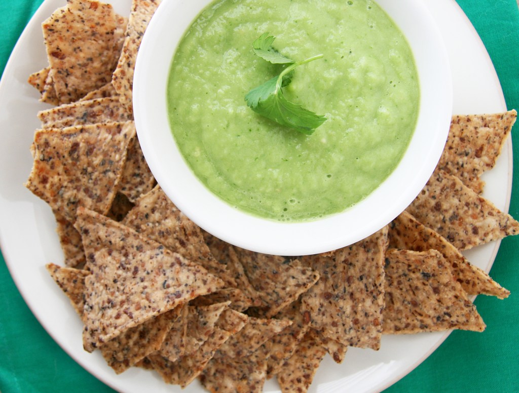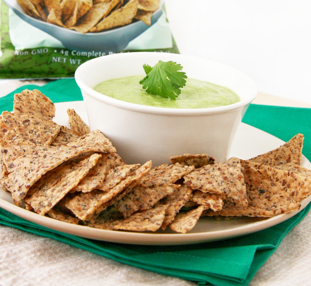 I could have enjoyed these crunchy chips plain straight out of the bag but thought a creamy but tangy dip would pair nicely. I bought a couple avocados and tomatillos and whipped up an incredibly quick and easy dip that helps extend the avocado (which can be a bit pricey). The tomatillos and lime add a beautiful brightness to the dip while the avocado provides a smooth mouthfeel with a slight kick from the jalapeno. This dip could also be served as a sauce over grilled steak, fish or chicken or ladled over eggs or grains 🙂