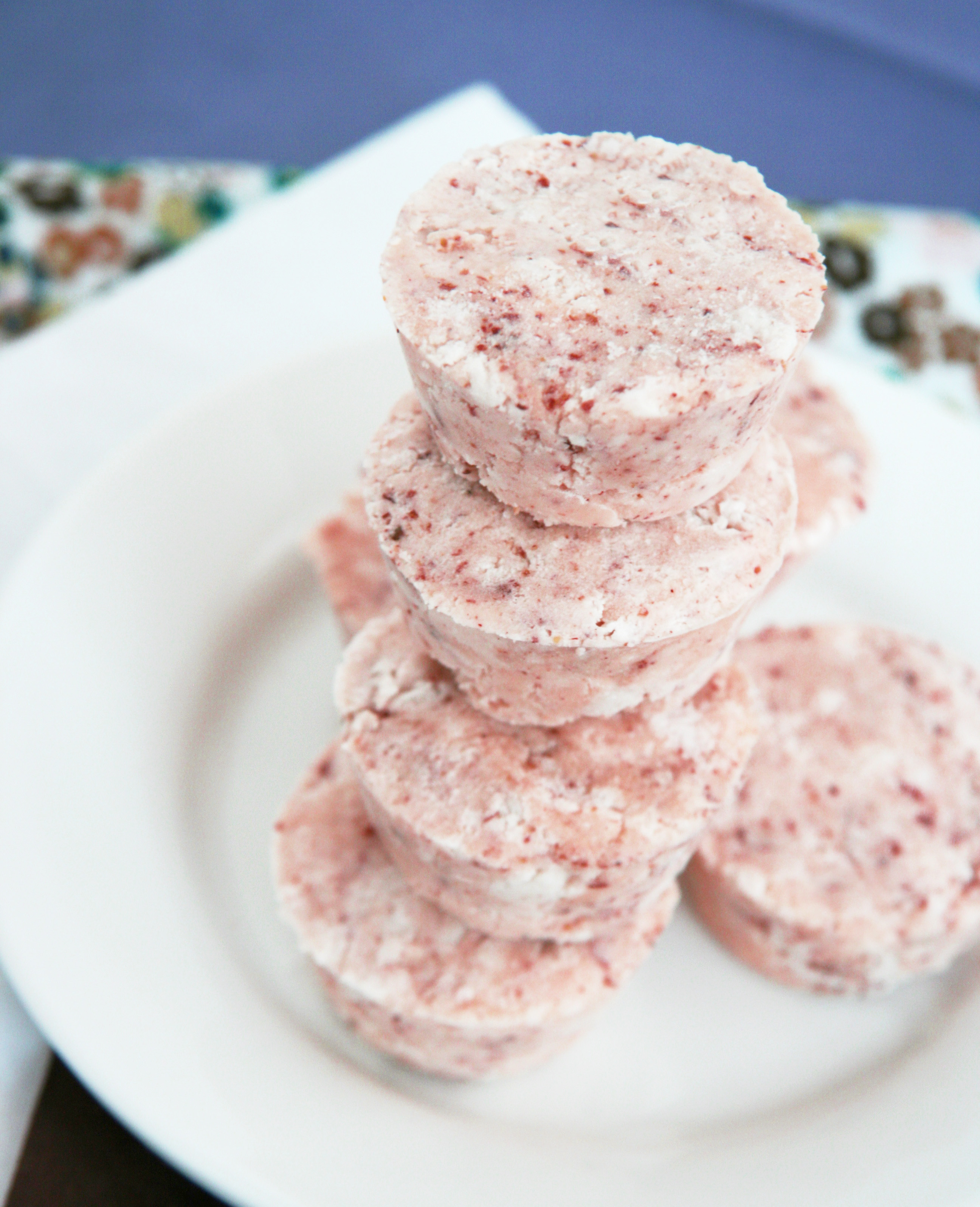 While very delicious in this first attempt, I plan to increase the amount of berries next time for flavor and color. I’d like to try these with different fruits as well and nut butters for a little variety. I also learned to keep all ingredients (except the melted coconut butter) at room temperature for a more uniform consistency…the cold berries I used in this batch hardened the coconut butter more quickly than expected but it doesn’t affect the flavor!