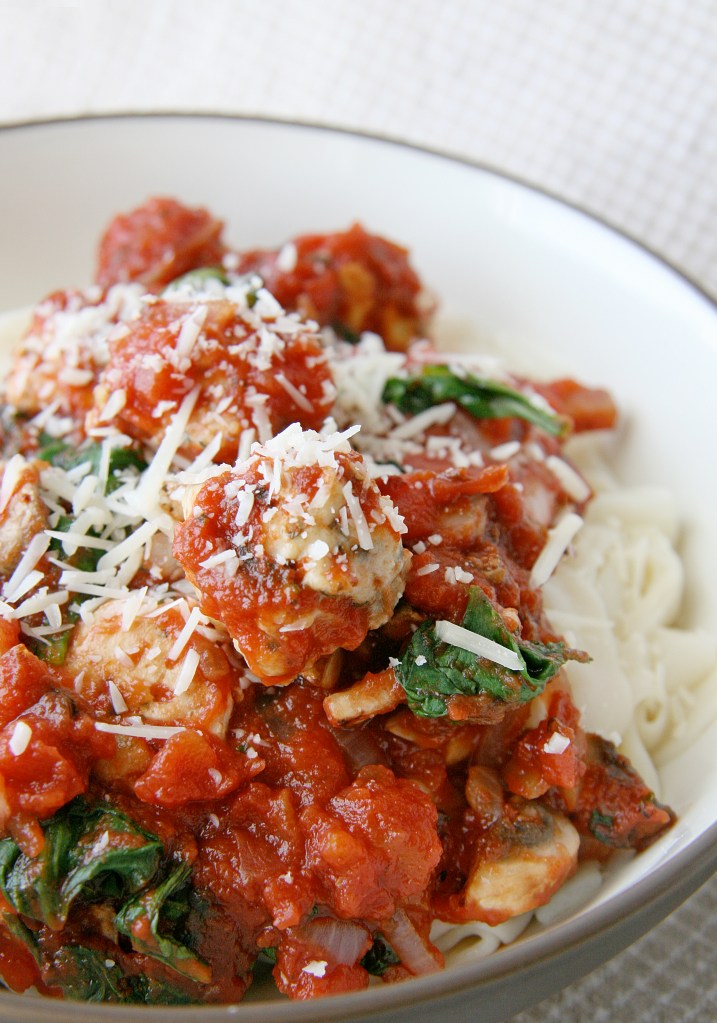 Pasta and meatballs – a classic comfort food. It was rainy and dreary this past weekend and I was in the need of some comfort…in the form of food. No surprise there 🙂 I love meaty tomato sauce with a bit of texture and a big serving of vegetables, and this dish is exactly that. I could even eat the sauce and the meatballs together without the pasta and still be a happy camper! Although there are only two of us at the dinner table and this dish could easily serve four, I love to make a big batch for leftovers to nosh on during the week.