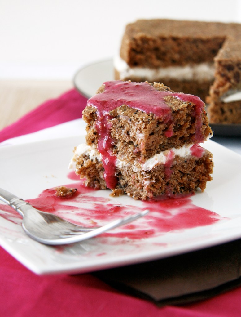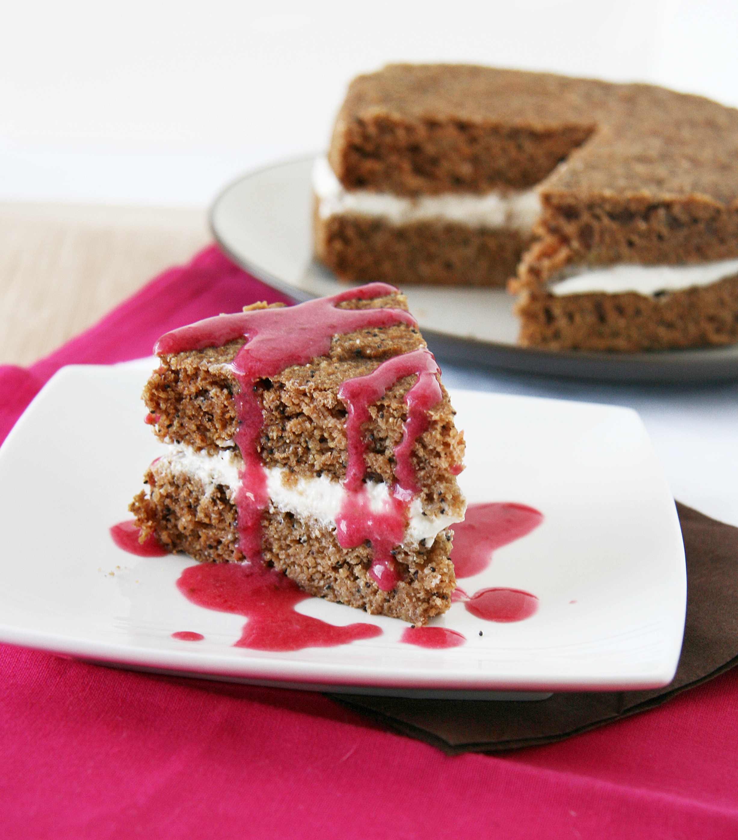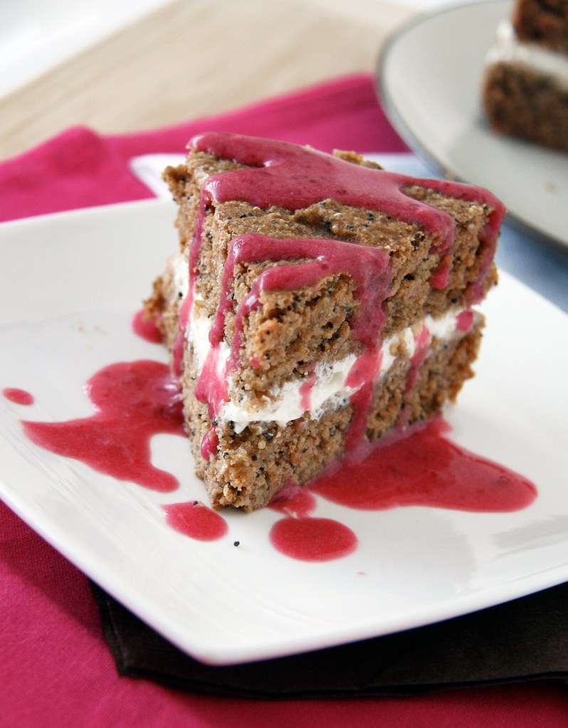 Vegan Poppyseed Amaranth Cake with Cream Cheese Frosting and Raspberry Beet Coulis