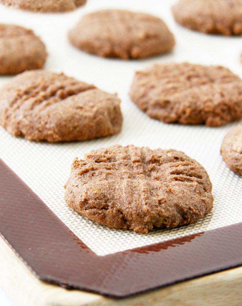4. Use a cookie scoop to portion the dough into 12 cookies and roll each one. Set them on the prepared cookie sheet about 1 1/2 inches apart from each other. Use the tines of a greased fork to press down the center of the cookie (optional, or you can slightly flatten). Bake for 10 – 13 minutes until the cookies are set, mine took 10 and a 1/2 minutes. *Make sure not to overbake, the cookies will be soft in the middle and chewy.