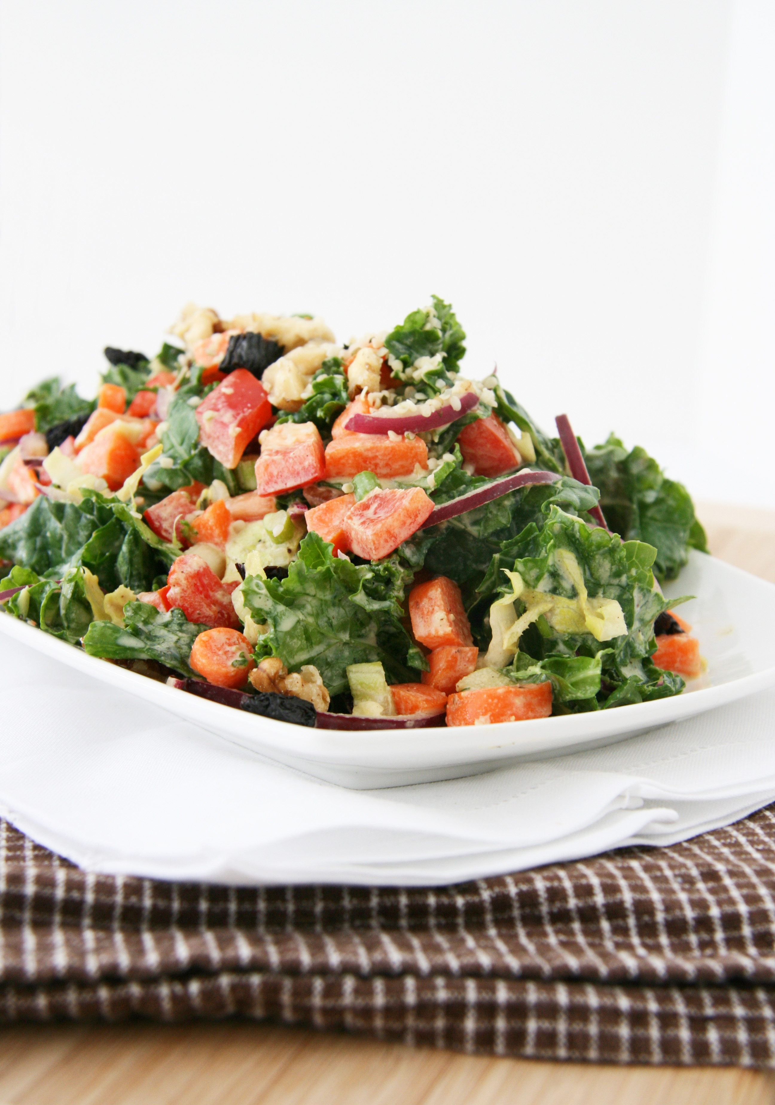 - Mix the vegetables, greens and dressing (to taste) in large bowl until thoroughly combined. Garnish with hemp seeds and walnuts.