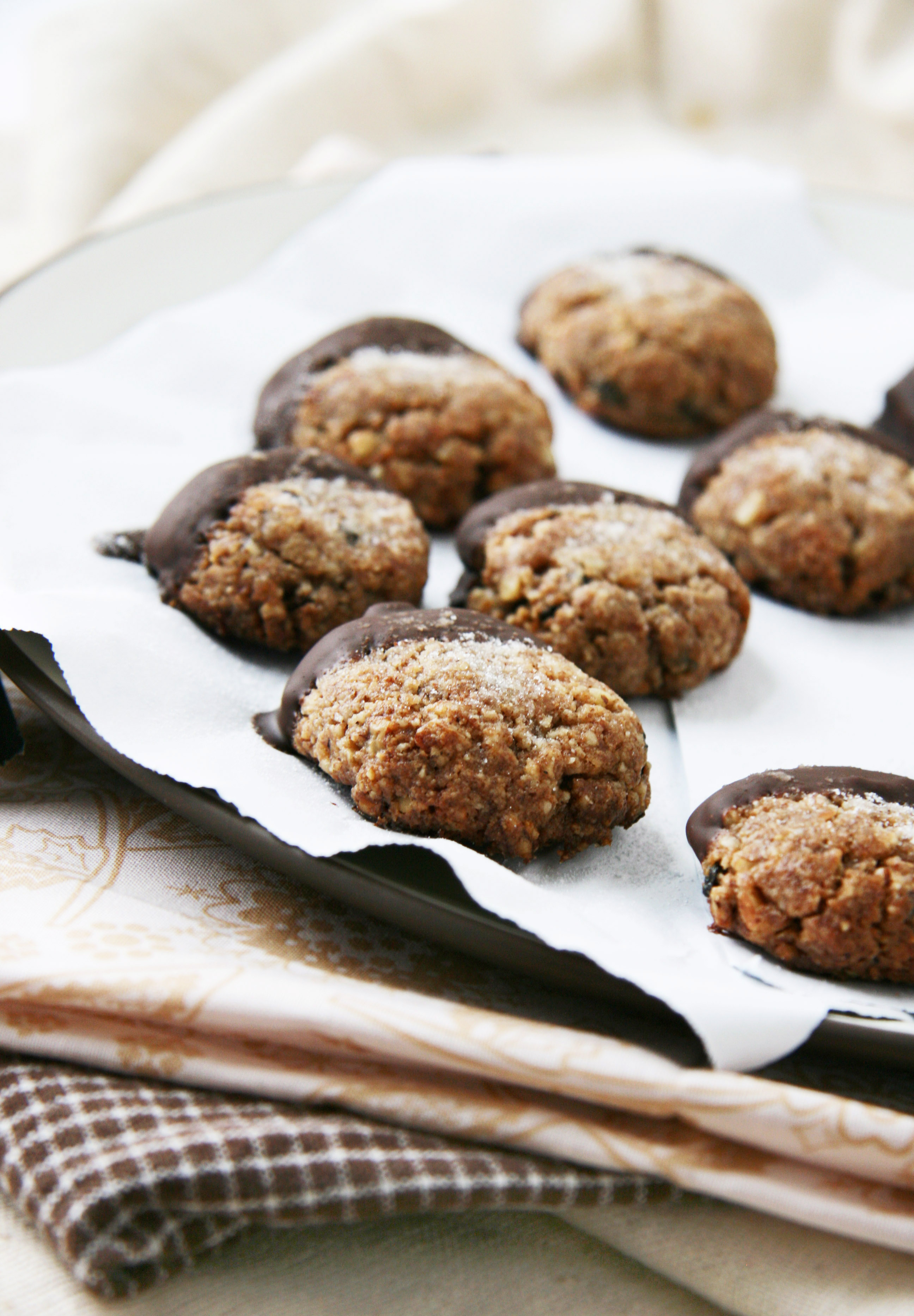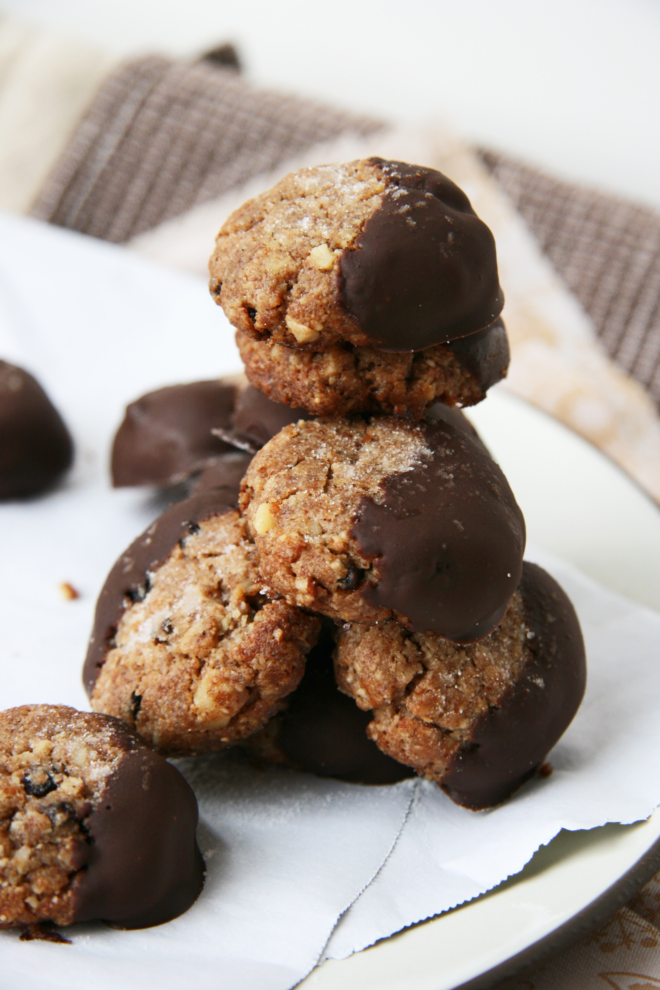 These little nutty bites have a slight crunch and are grain-free, easy and delicious! Any chopped dried fruit would be a great substitute for the currants if you prefer – I am thinking dried cherries and/or apricots would be a delightful add-in. The chocolate coating might be optional for some of you, but I thought they added that extra “oomph” to the cookie, though carob chips or white chocolate or a coconut butter coating would be lovely as well.